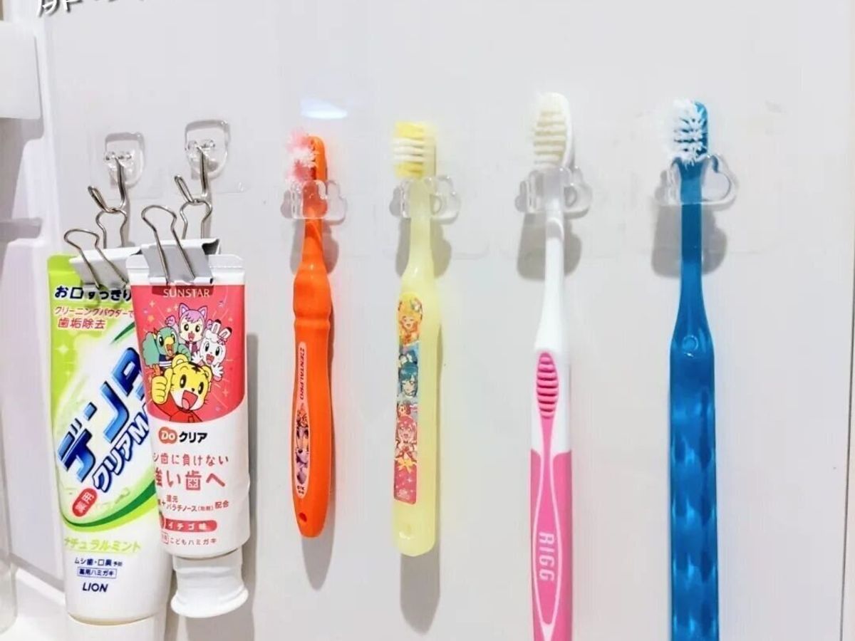 「貼ってはがせる歯ブラシホルダー くも型」は、歯ブラシをひとつひとつ収納することができるアイテム。くも型になっている本体の横から歯ブラシを引っかけます。貼ってはがせるタイプなので、手軽に試しやすいところも魅力的なポイント。洗面台の扉裏や鏡などに取りつけることができますよ!