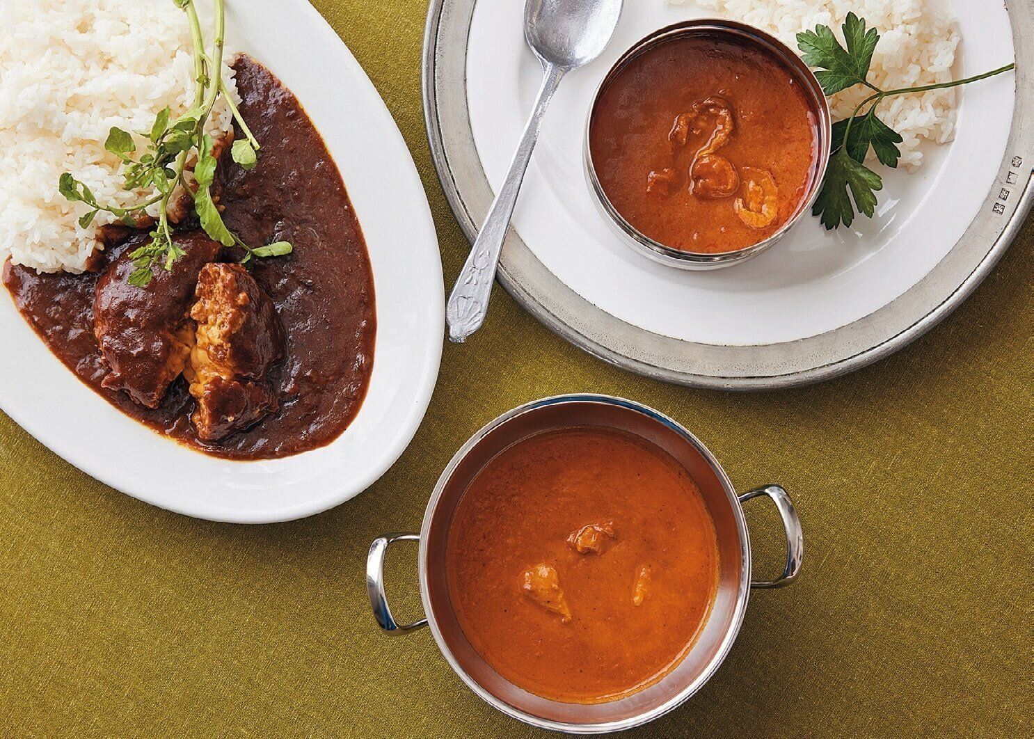 (左から)「素材を生かした ハンバーグのデミグラスソースカレー」¥490、「惣菜を生かしたカレーチキンティッカマサラ」¥350、「素材を生かした ほたてと海老のビスクカレー」¥490