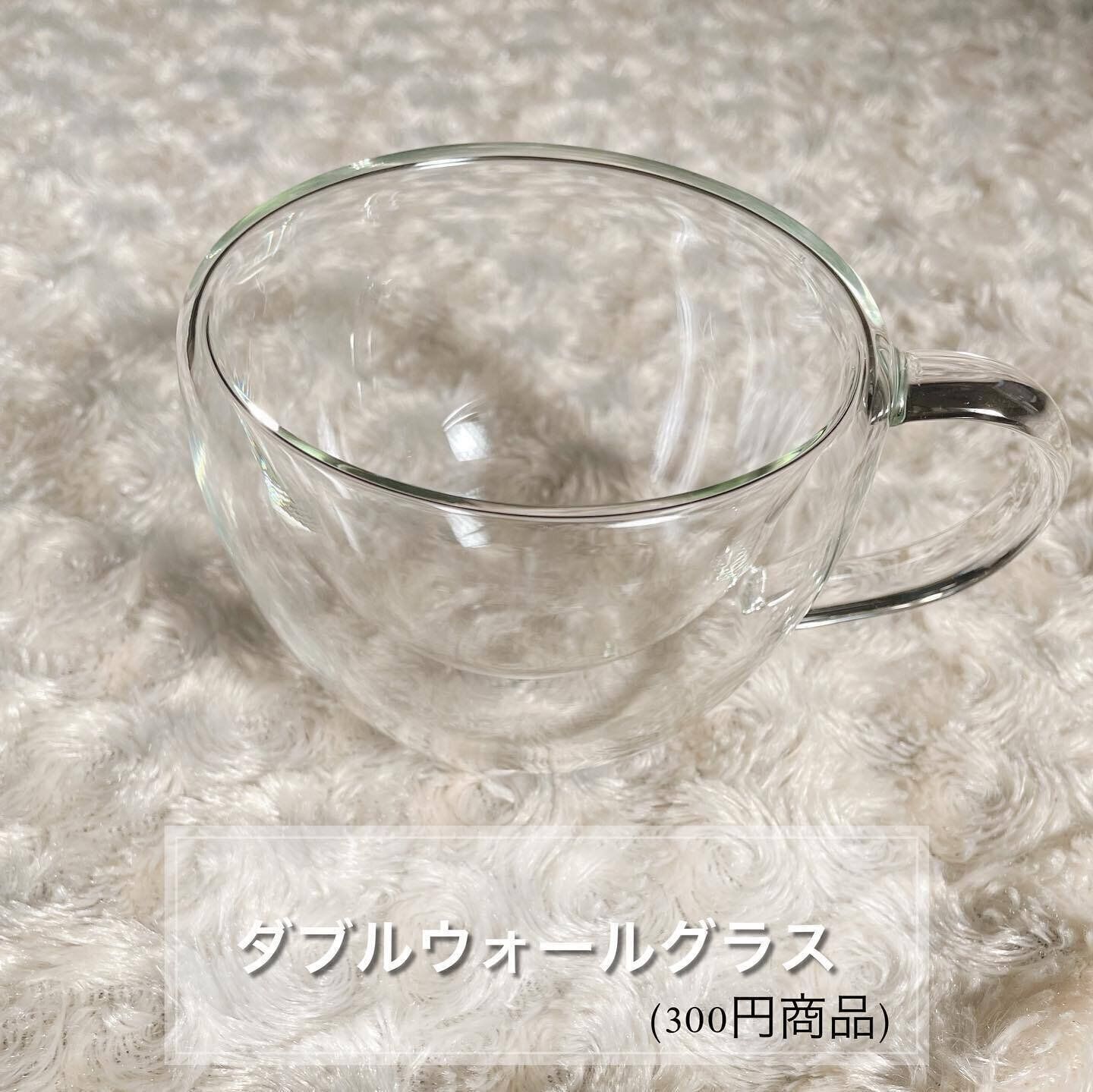 流行の耐熱ダブルウォールグラス(330円)は、ホットドリンクがおいしい季節にぴったりのアイテムです。紅茶やハーブティー、コーヒーを入れても素敵。取っ手がついているのもうれしいですね。リーズナブルなので、来客用に何個かそろえておきたいです。
