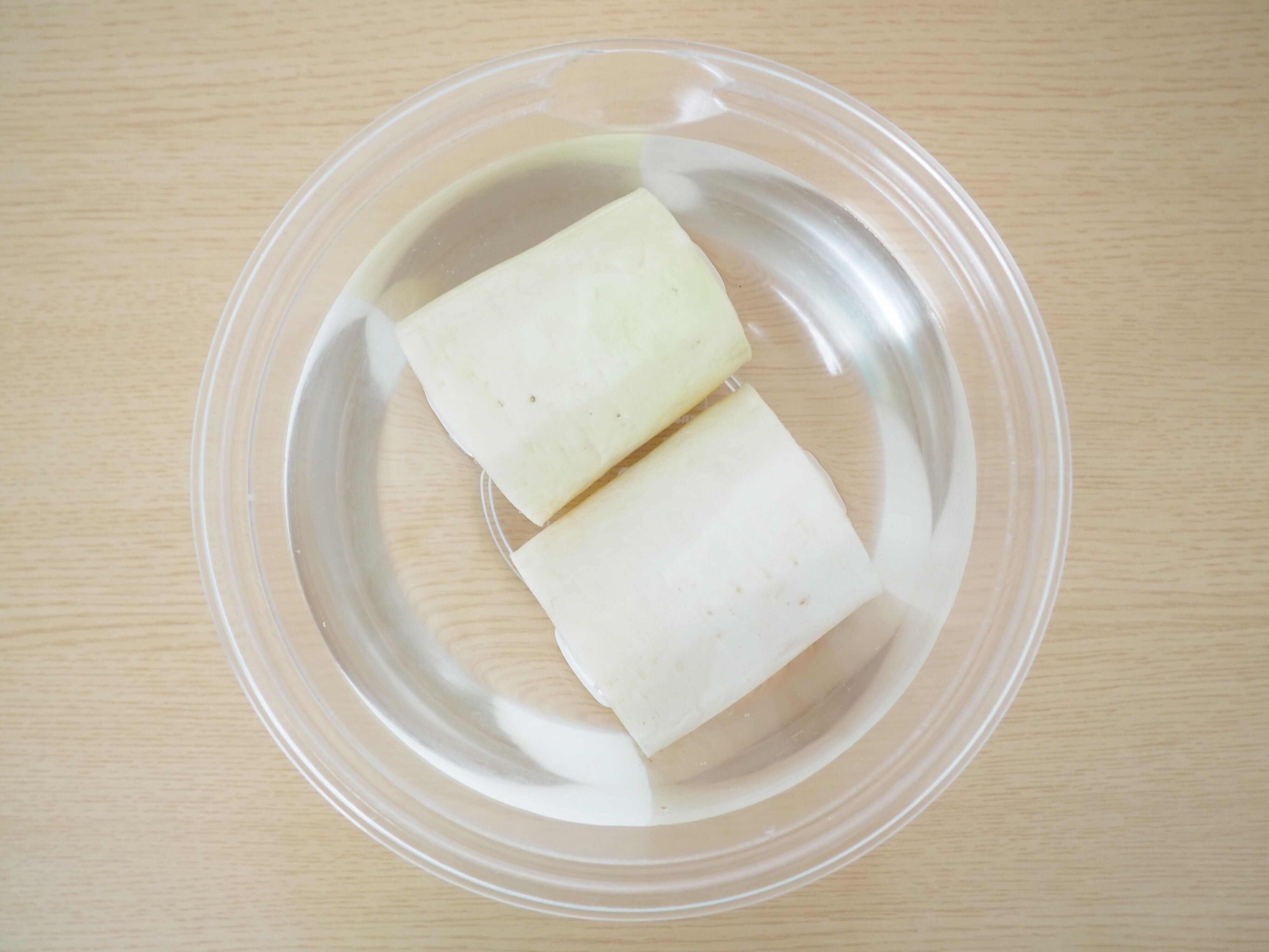 あとは水に漬けて半日置くだけ。今回は長さがあったので、さらに半分に切ってボウルへ入れました。