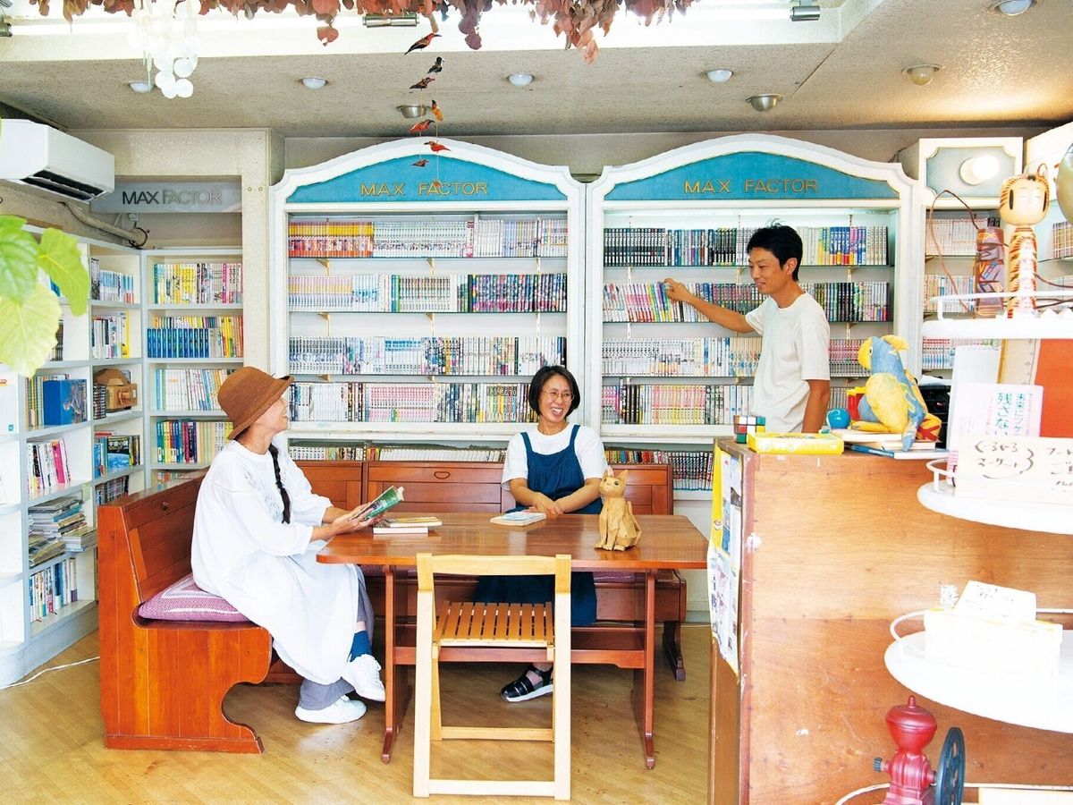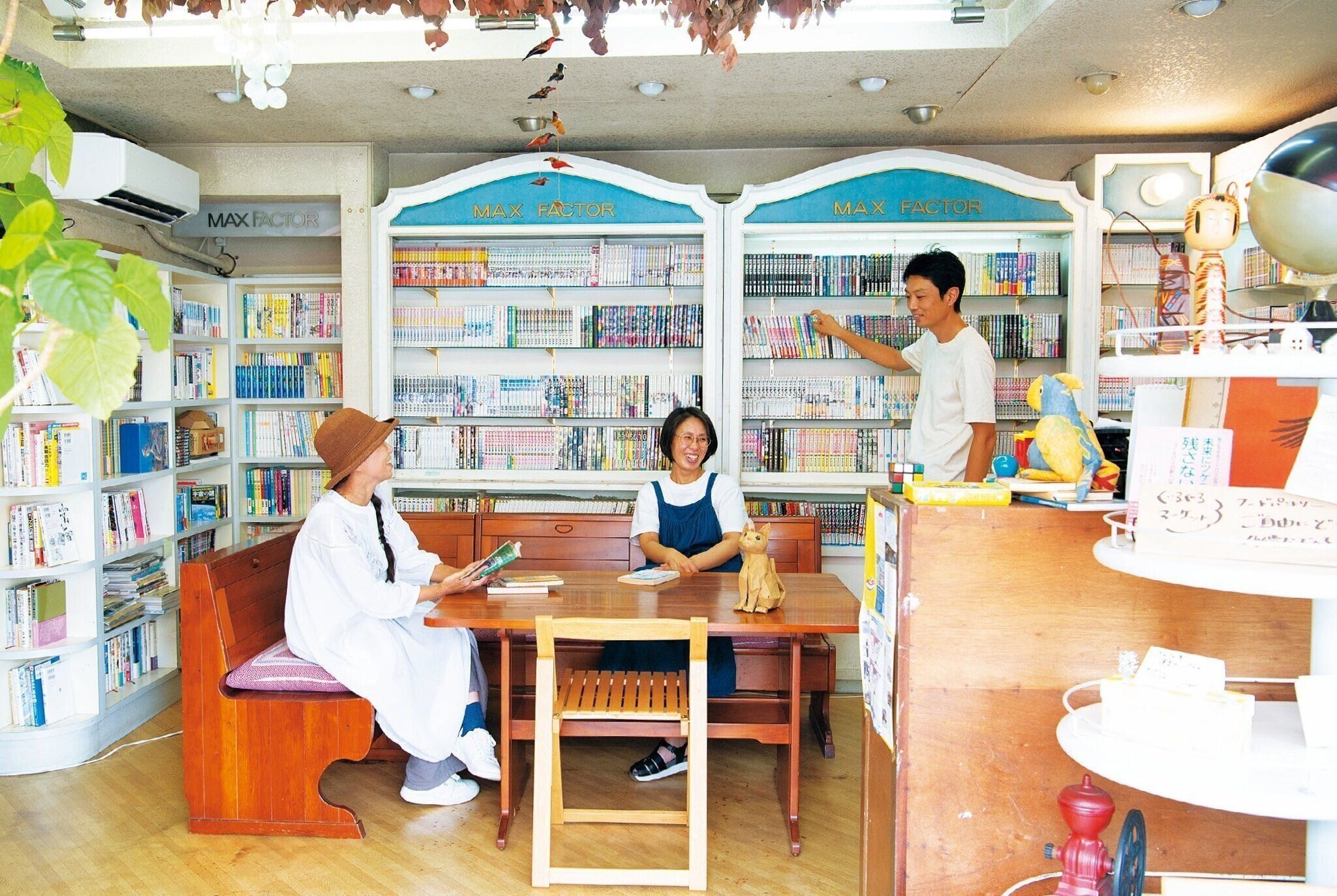 「シャッターがずっと閉まっていたから知らなかったんですが、中に入ったら化粧品用の棚がたくさんあって。本を並べるにはピッタリ。やるしかない!」と決断した瀬戸さんがつくったのが、仲間の蔵書を持ち寄った私設図書館「さんさん舎」。大人も子どもも無料で立ち寄れ、のんびりと本やまんがを読める場所です。