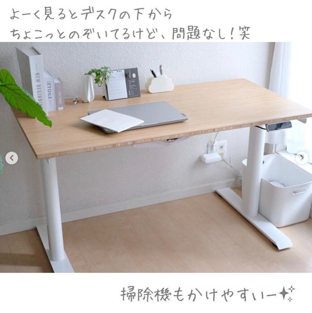 デスクの下はとくにいろんなケーブルがごちゃごちゃしやすい場所。掃除機をかけるのも一苦労だったりしますよね。こちらの写真、じつはダイソー商品を使って「デスク下」にケーブルを収納しているんです。