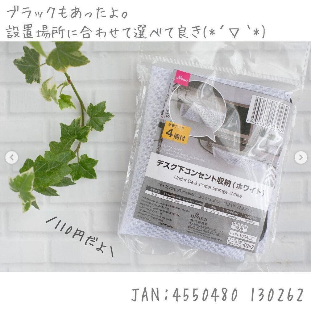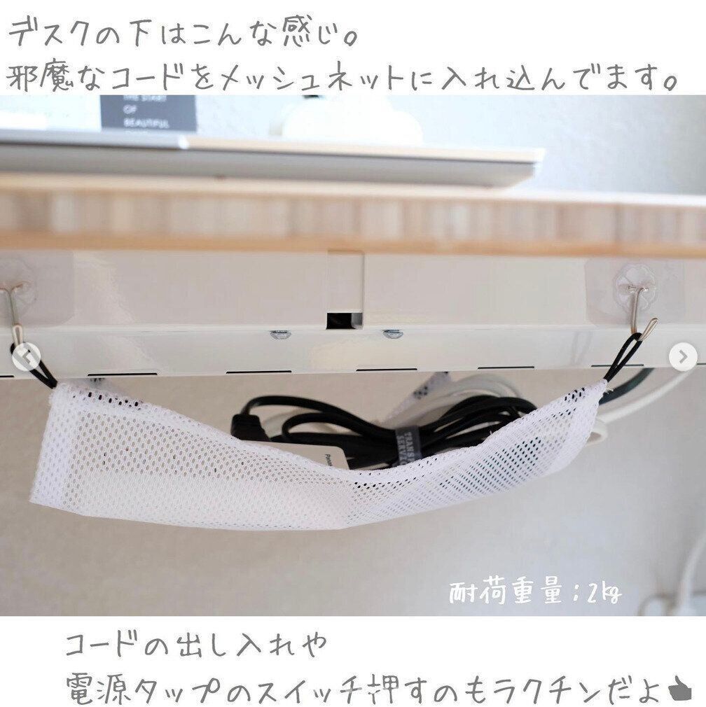 メッシュネットと、粘着フック4個つきで110円というお手ごろ価格!色はブラックもあるそうなので、おうちのデスクの色に合わせて選んでみてくださいね。