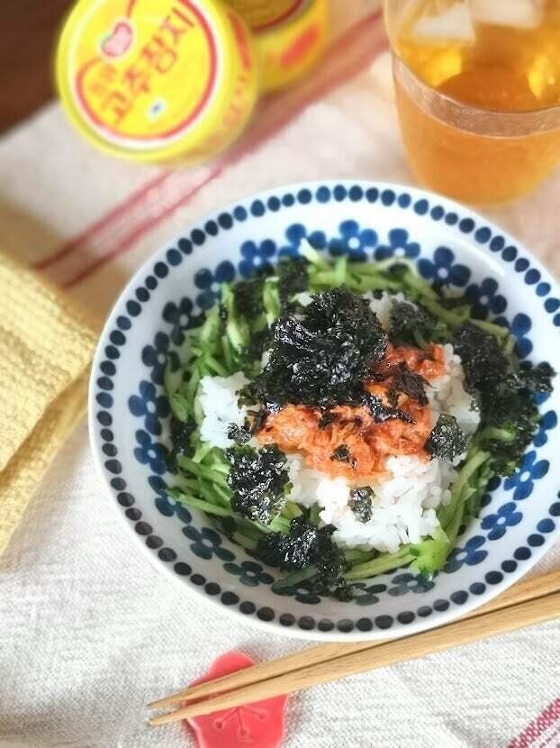 韓国のりフレークとあわせて盛り付ければ、あっという間に「韓国ツナピリ辛丼」の完成です。