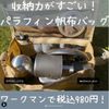 パラフィン帆布スクエアトート(980円)は、キャンプ用品を収納するのにぴったり。パラフィン加工なので、多少の雨でも問題なく持ち運びできます。見た目以上に容量が大きいので、細々したキャンプギアをすっきりと整理してしまうことができます。「かなりいいです」というコメントからも、満足度の高さがうかがえます。