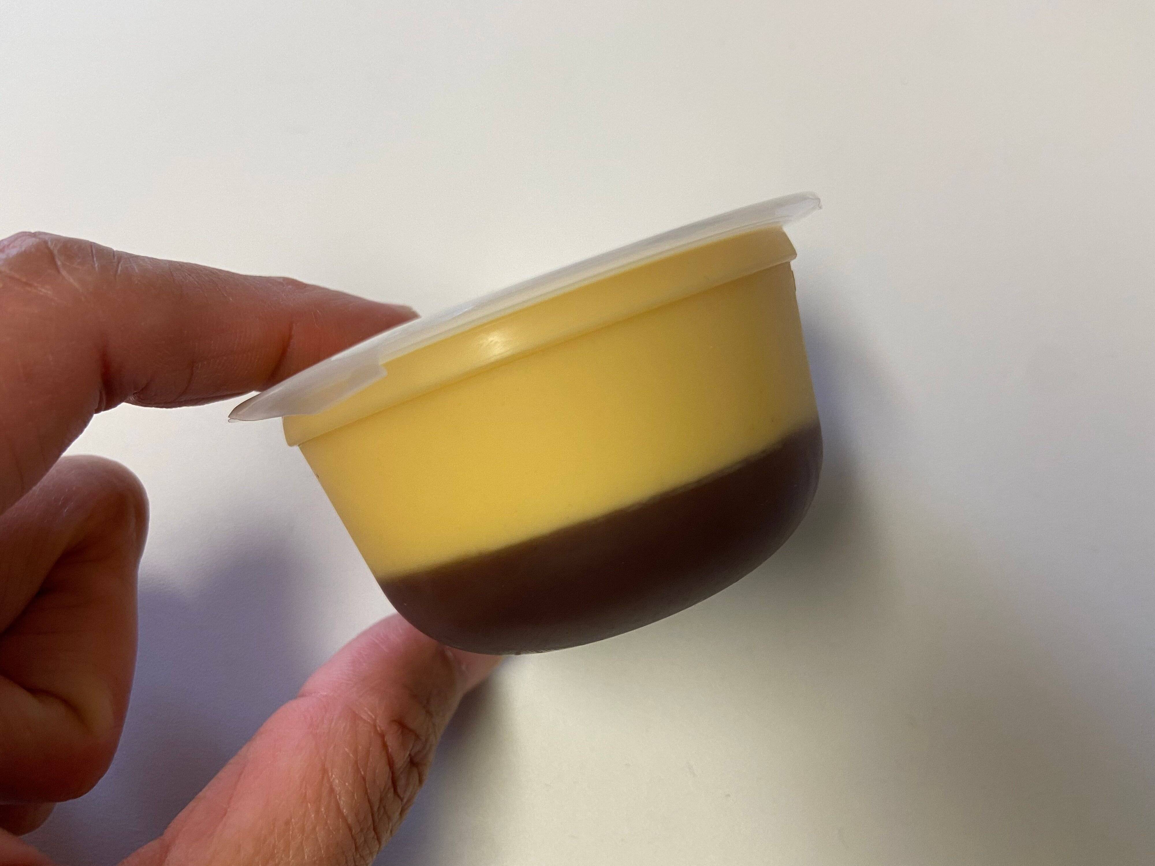 袋を開けると中には容器に入ったプリンが。きれいな2層になっているのがわかります。プリンといえば底にあるのはカラメルですが、こちらはたっぷりの水羊羹が入っているんです。