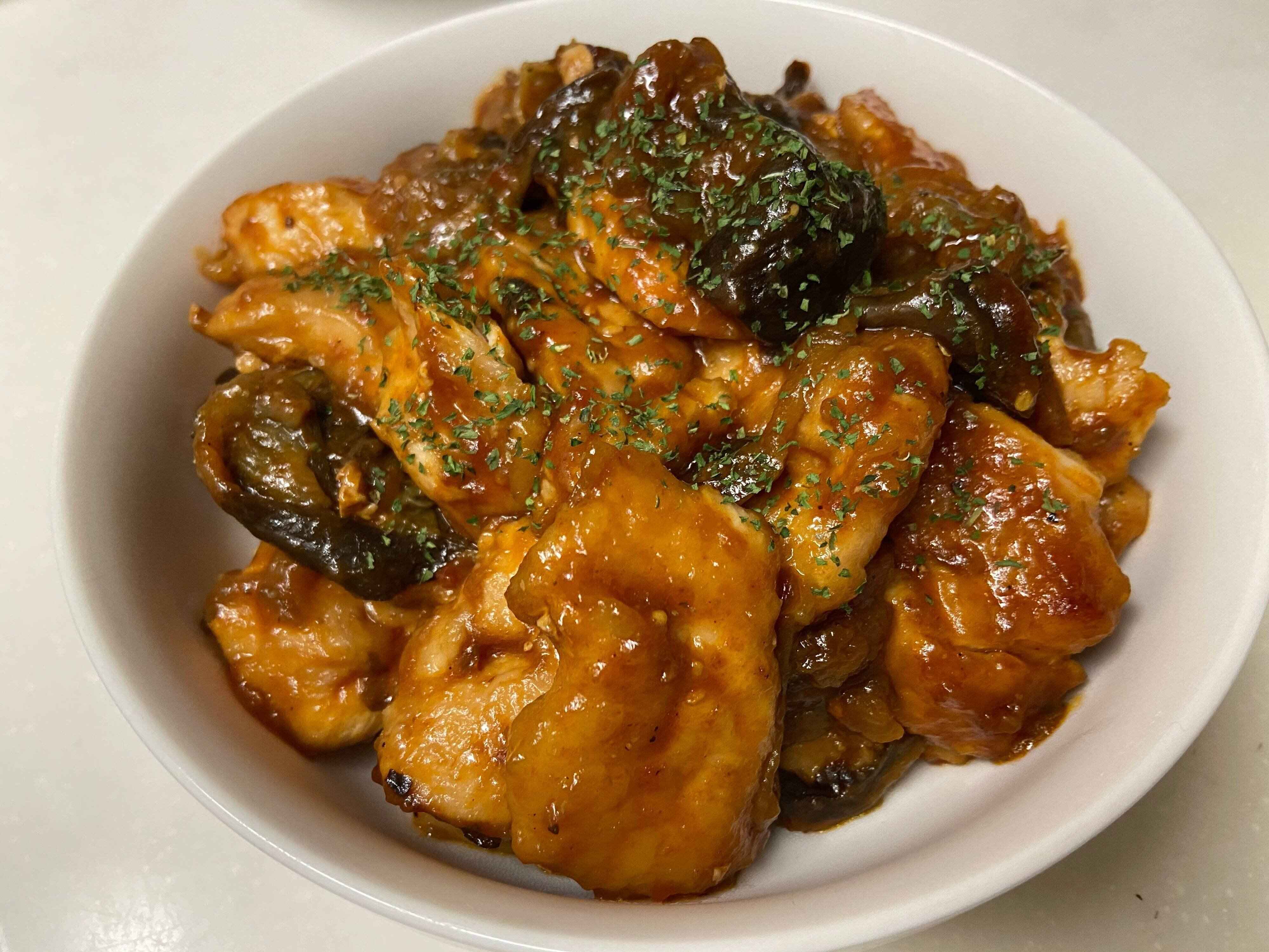 カリフォルニアギフトパスタソース(トマト&ガーリック)を使って作ったチキンのトマト煮込み。トマトソースに相性のいい茄子も合わせました。