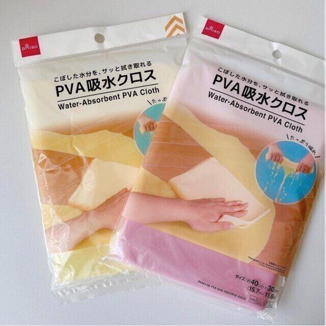 こちらは大活躍間違いなしのアイテム「PVA吸水クロス」(110円)。抜群の吸収力なので、飲み物をこぼしてしまったり、キッチンをさっと拭きたい時など簡単にキレイにすることができます。しっかりと厚みもあり、大きさも約40cm×30cmの大判サイズ。使用した後は、しっかりと絞って乾かせば繰り返し使うことができるのでコスパも◎。
