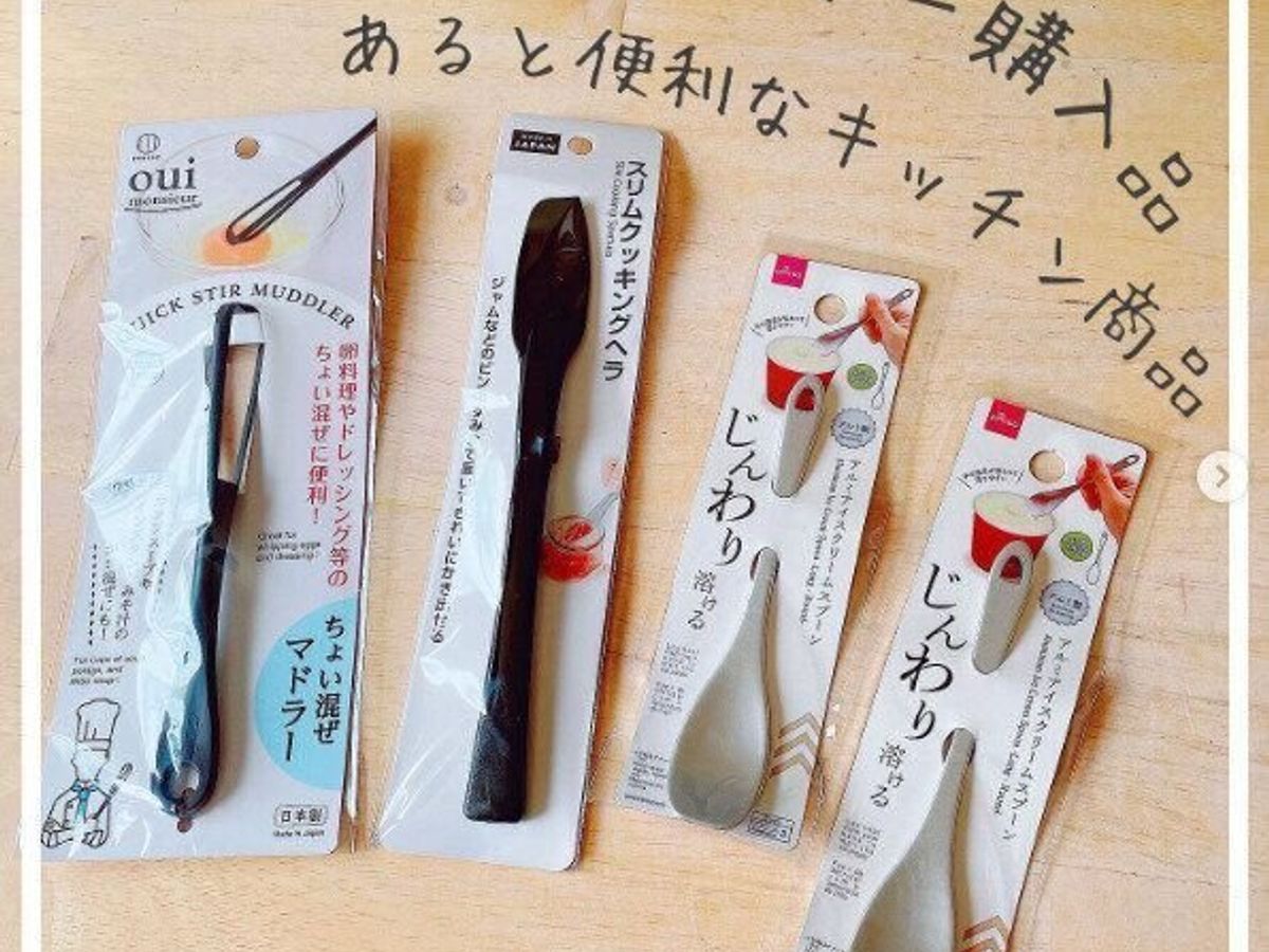ダイソーにはたくさんのキッチンアイテムがありますが、なかでも便利と評判になっているのが、「ちょい混ぜマドラー」「スリムクッキングヘラ」「アルミアイスクリームスプーン」など。「ちょい混ぜマドラー」は卵や調味料など、ちょっとしたものを混ぜるのにとても便利。「スリムクッキングヘラ」はジャムなどの瓶の底まで届き、きれいに中身を取ることができるそう。あれば便利な商品ですね。そして「アルミアイスクリームスプーン」はカチコチのアイスにもスーッとささり、アイスが食べやすくなるそう。これは家族分そろえておきたいですね!