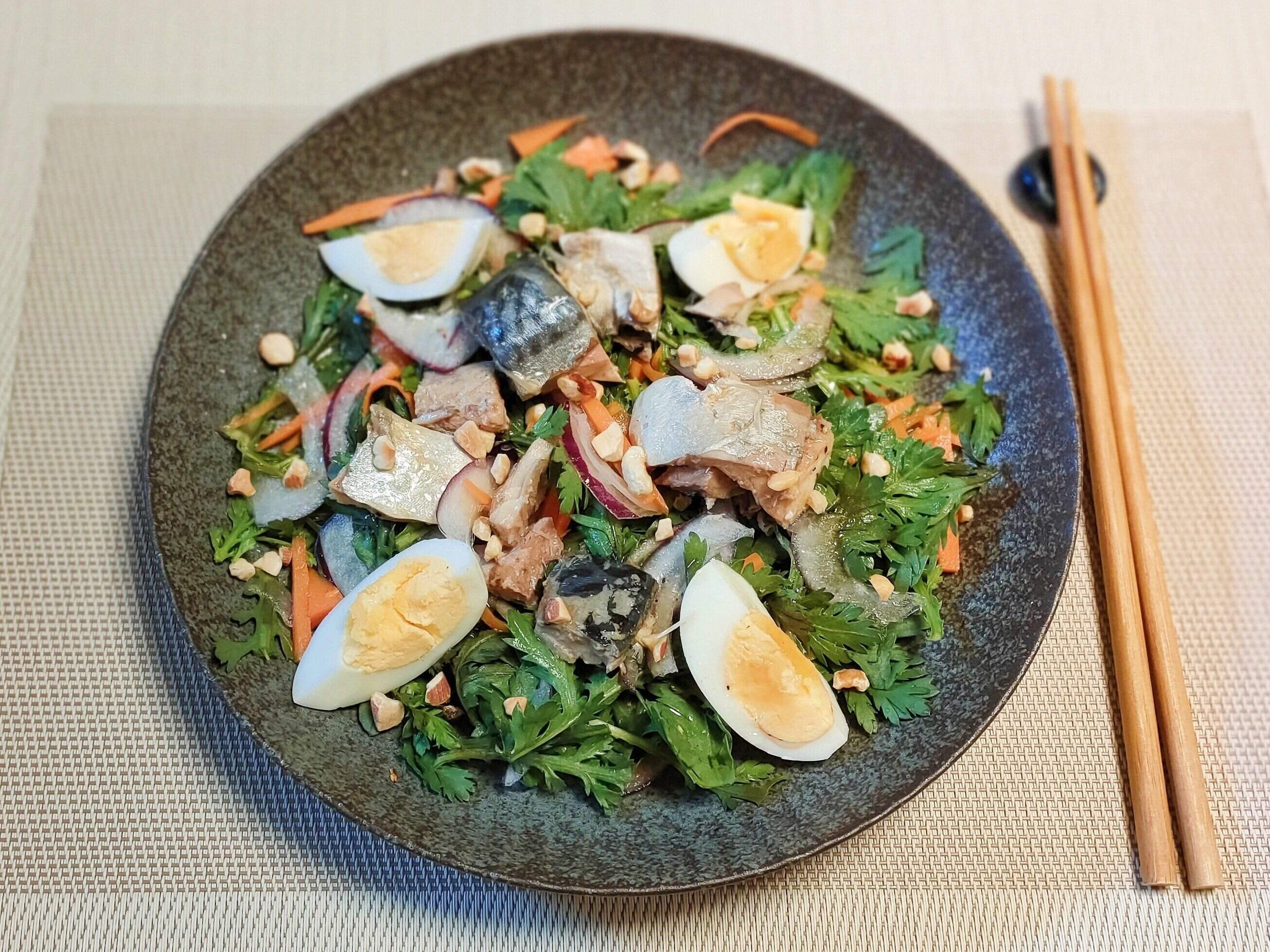 美ボディを目指す人におすすめな、サバ缶を使ったおかずサラダ。タンパク質たっぷりでメインの食事にしてもOKなほどボリュームもアリ!