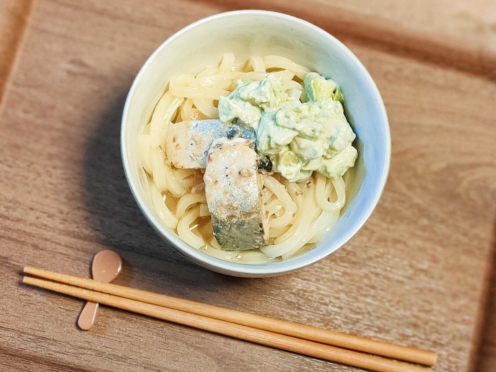 うどんの汁はサバの汁のみで十分!お好みでネギや海苔をちらしてください。さっぱりとした塩気とアボカドのコクを楽しめる一品ですね。