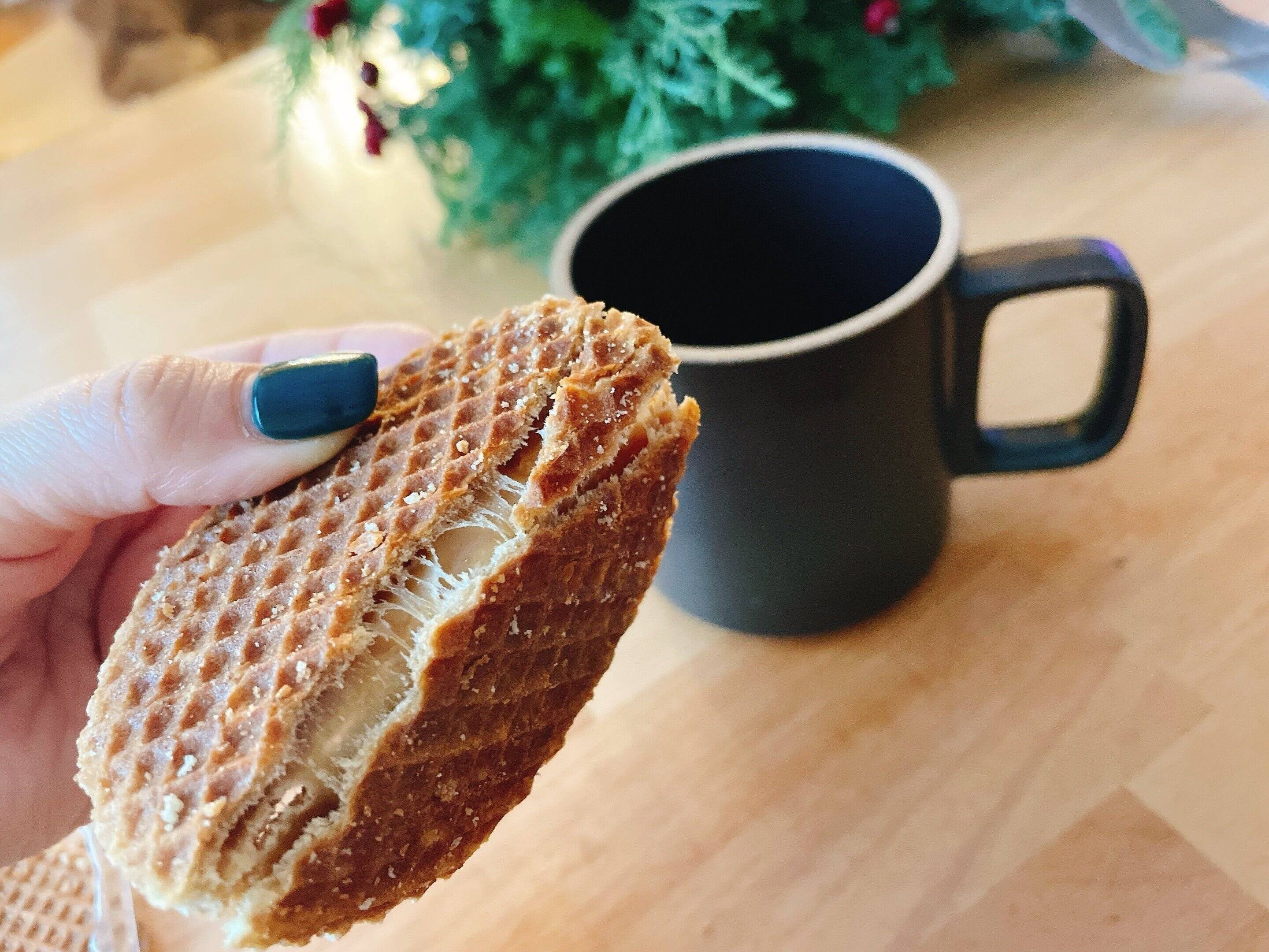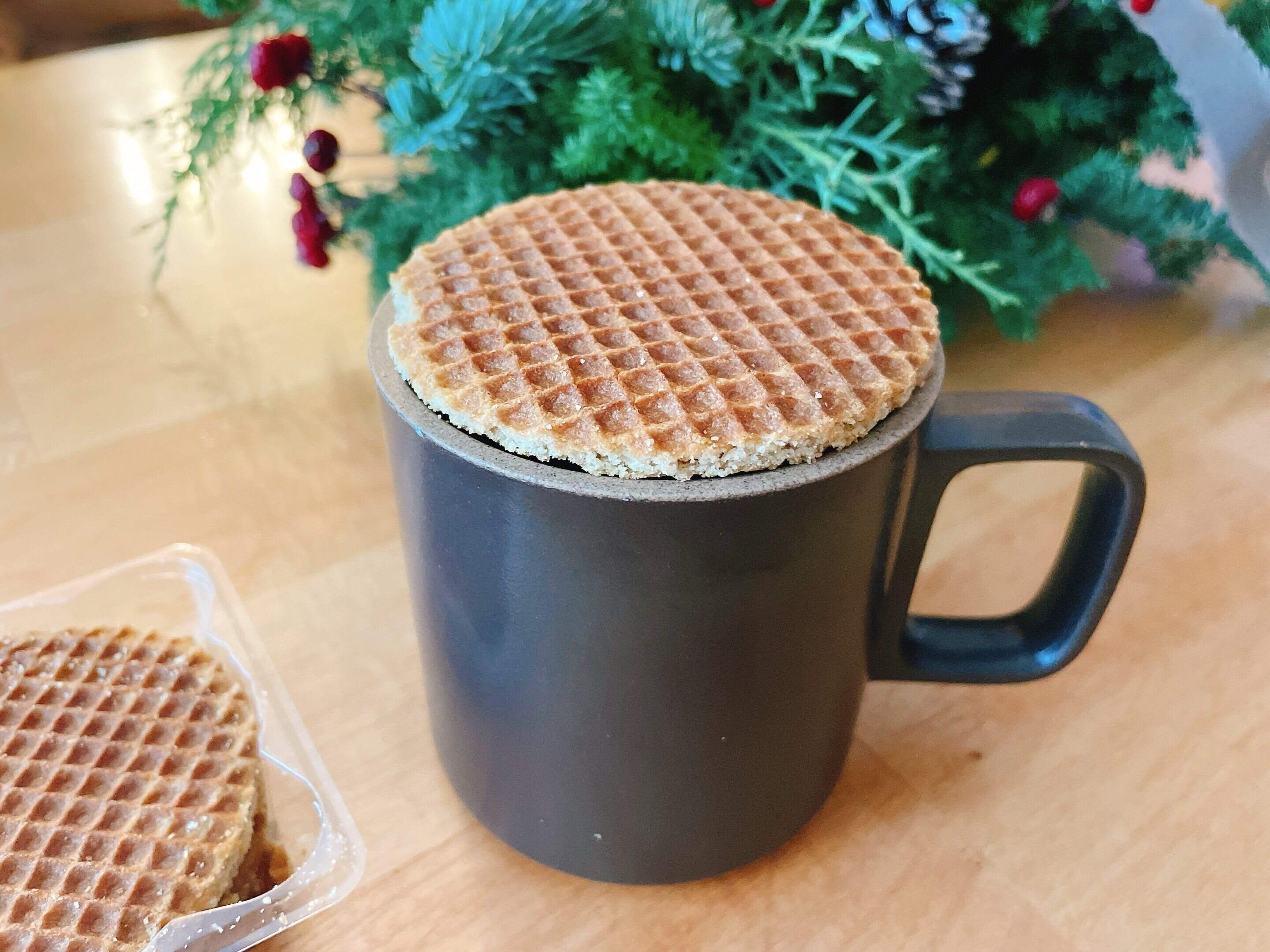 そのままでももちろんおいしいのですが、温かいコーヒーや紅茶を淹れたマグカップの上にこの「ストローワッフル」をおいて、中のキャラメルシロップを少し溶かして食べるのがポピュラーな食べ方です。