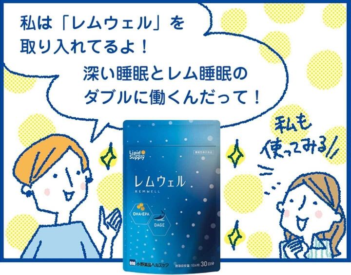 「レムウェル」にはDHA、EPA、DAGE(ジアシルグリセリルエーテル)が含まれており、一時的に睡眠に不満を感じている健康な方の深睡眠とレム睡眠の割合を増加させることで、睡眠の質を向上させる機能があります。