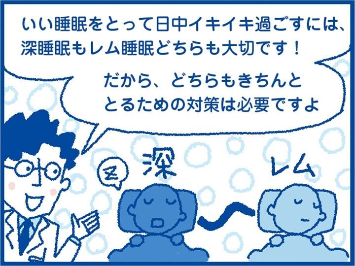 睡眠は、上のまんがのように、ぐっすり寝ている深い睡眠さえとれていれば大丈夫と思っていた方も少なくないのでは? 良質な睡眠をとるための、気になるあれこれをチェック!
