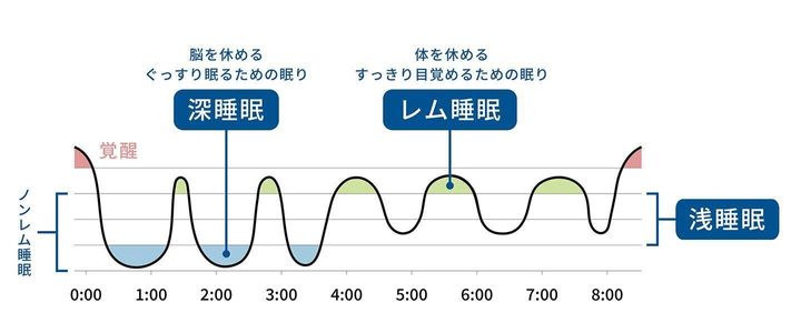 A.睡眠には3つのステージがあります。脳を休め、ぐっすり眠るための「深い睡眠(深睡眠)」と、体を休め、すっきり目覚めるための「レム睡眠」、深睡眠とレム睡眠に移り変わる間の睡眠が「浅い睡眠(浅睡眠)」です。いい睡眠のポイントは、睡眠時間の前半は深睡眠、中盤から後半にかけてはレム睡眠の量がしっかり確保され、そのサイクルが安定していること(※1)。