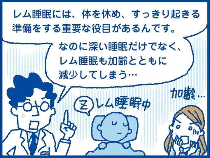 A. よい睡眠のために、こだわりの枕や入浴方法などで対策をすることはあると思いますが、そのほとんどが深睡眠を増やすためのもの。レム睡眠への対策はなかなかされていないのが現状です。しかも、レム睡眠も加齢が原因で減少してしまうとか。睡眠の質を向上させるには「深睡眠」とともに「レム睡眠」の割合も増加させる対策が必要。それに適した機能性表示食品が「レムウェル」です。