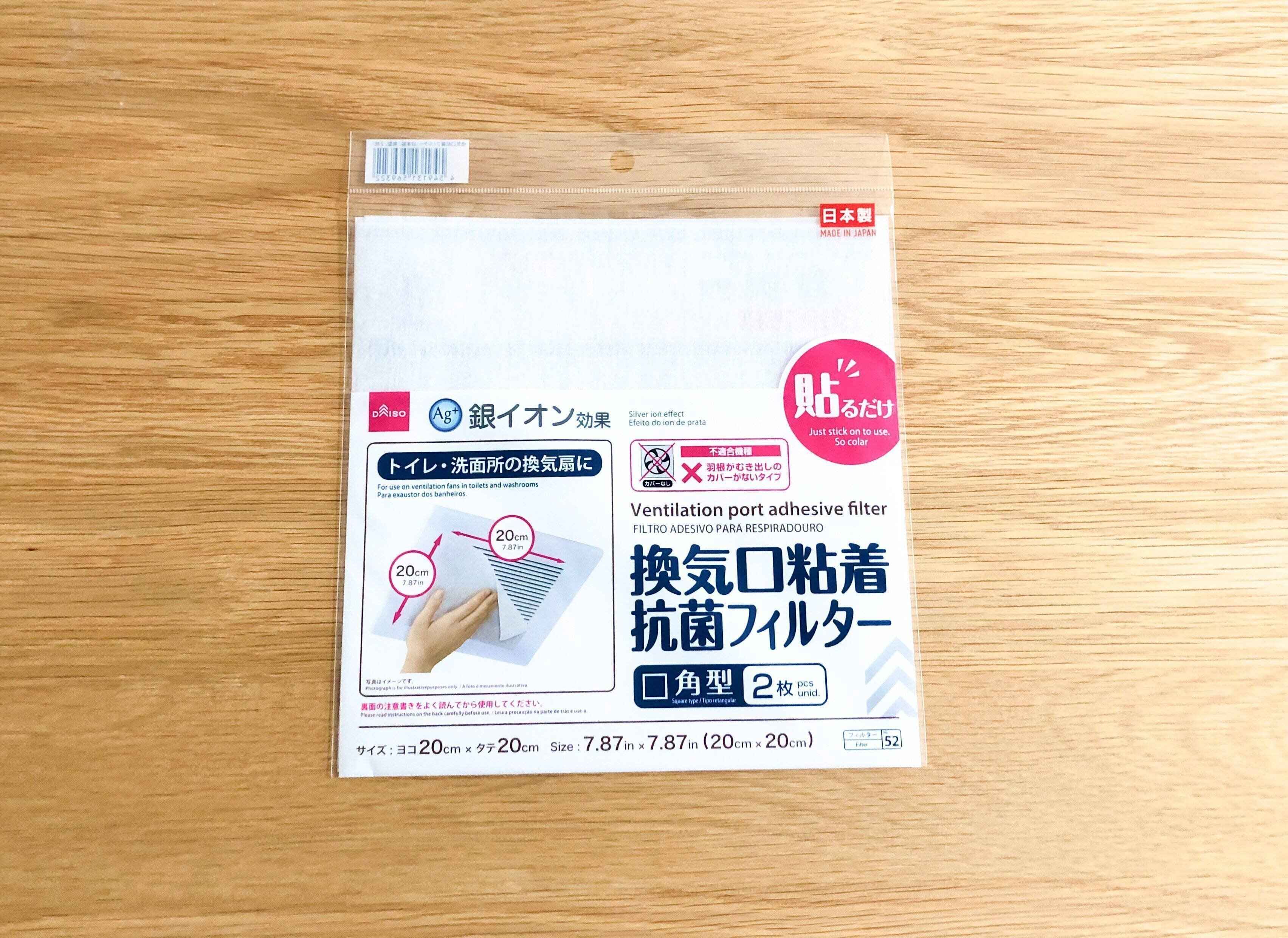 ダイソーの「換気口粘着抗菌フィルター」は、貼るだけで換気口内に埃が入り込むのを防いでくれるし、抗菌までしてくれる超優秀アイテムです。