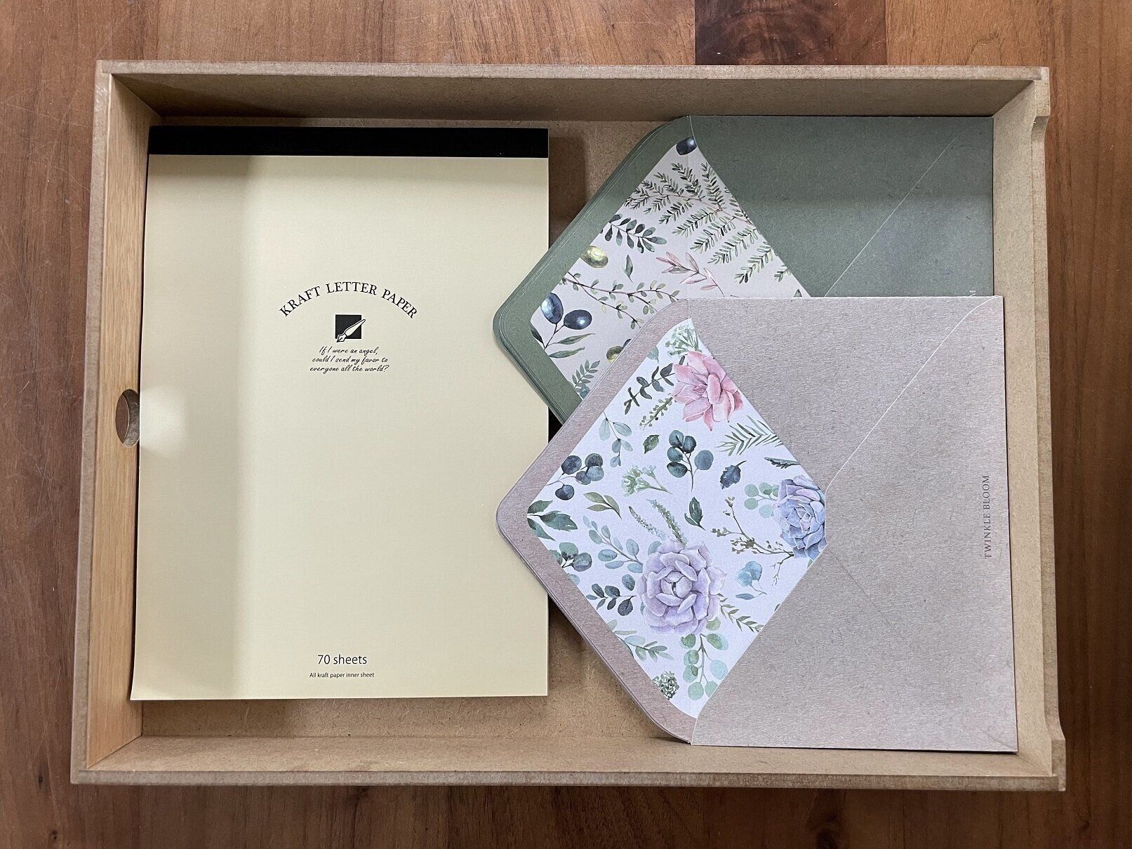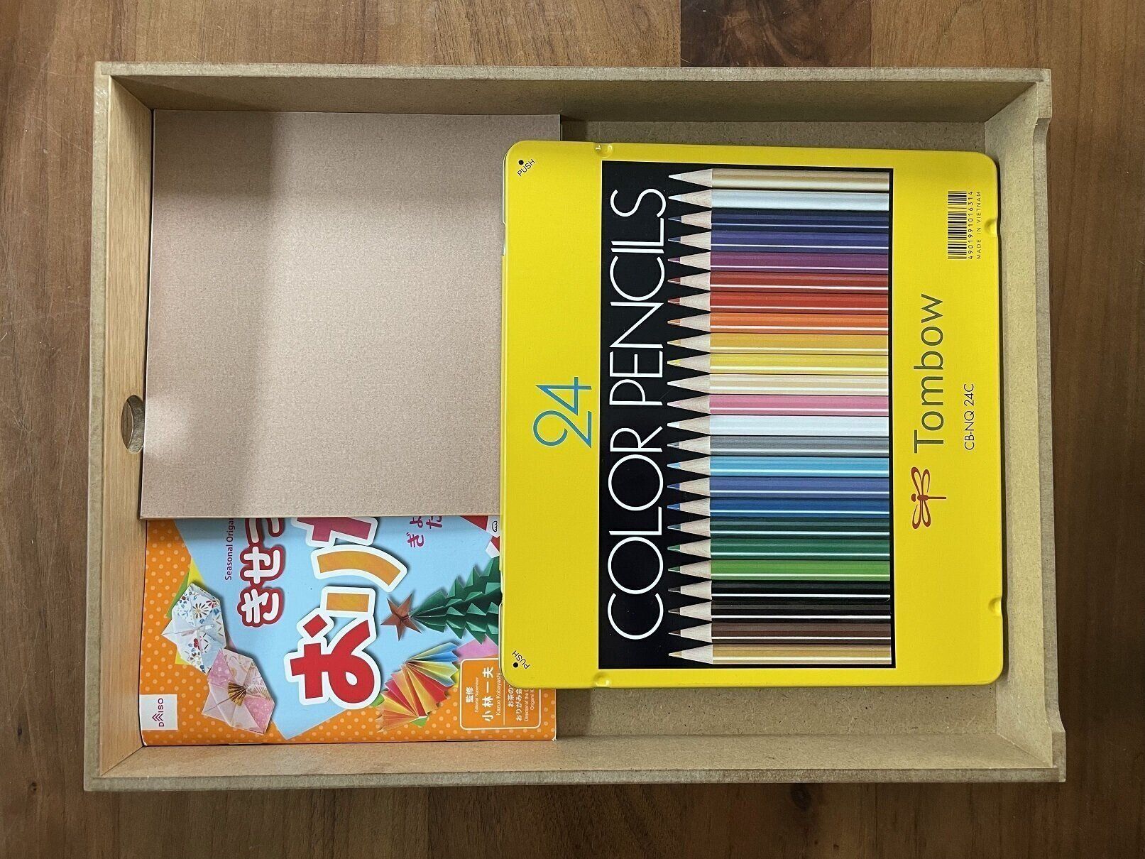 子どもが使うお絵描きセットや折り紙、また家族のレターセットもきれいに納まります。A4用紙も入るサイズになっています。