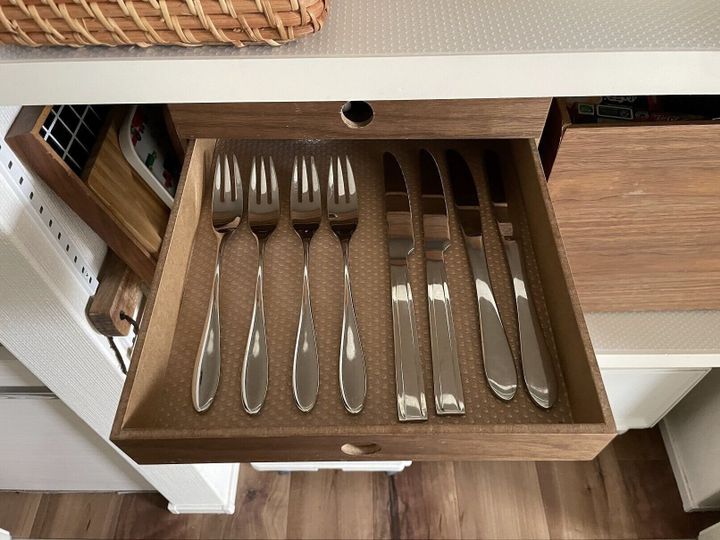 キッチンの背面がオープン棚収納で引出しがない場合、箸やフォークなどのカトラリー収納がむずかしい場合があります。