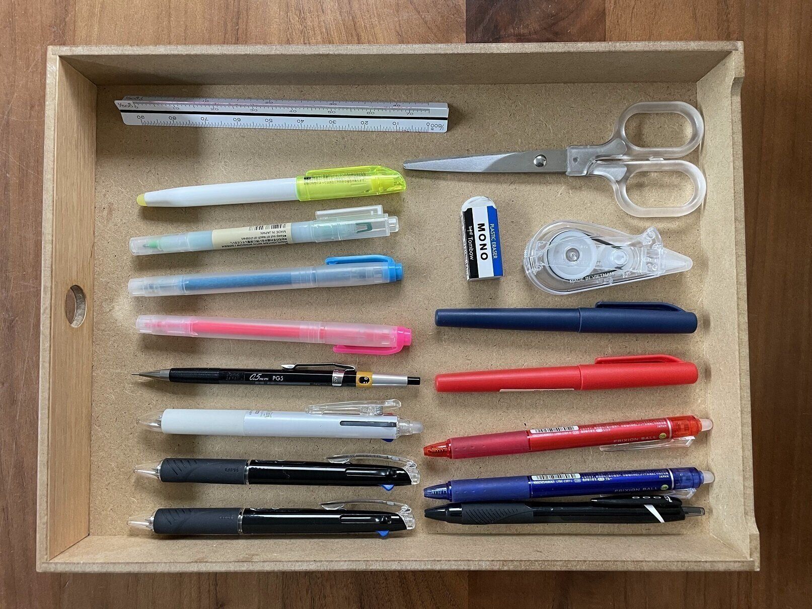 ペンなどの文房具は、よく使う1軍のみを引出しに入れましょう。開けたときに上から見て、サッと取れる量がベストです。