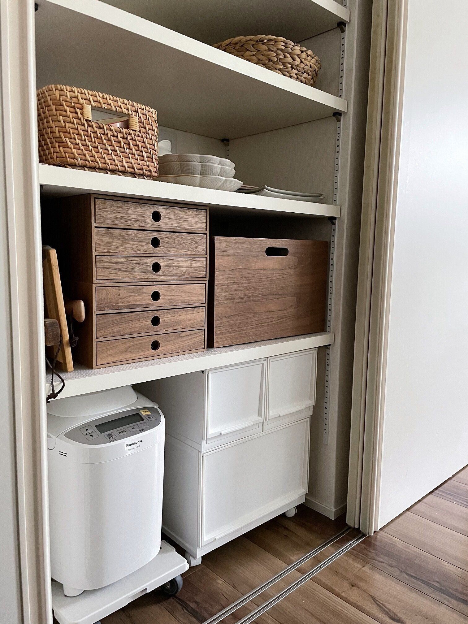 引き出しタイプの収納は、腰より下の位置に置くことで開けたときに中身が上から見え、ものの把握がしやすいです。また、奥に入れたものも取り出しやすいところがポイントです。