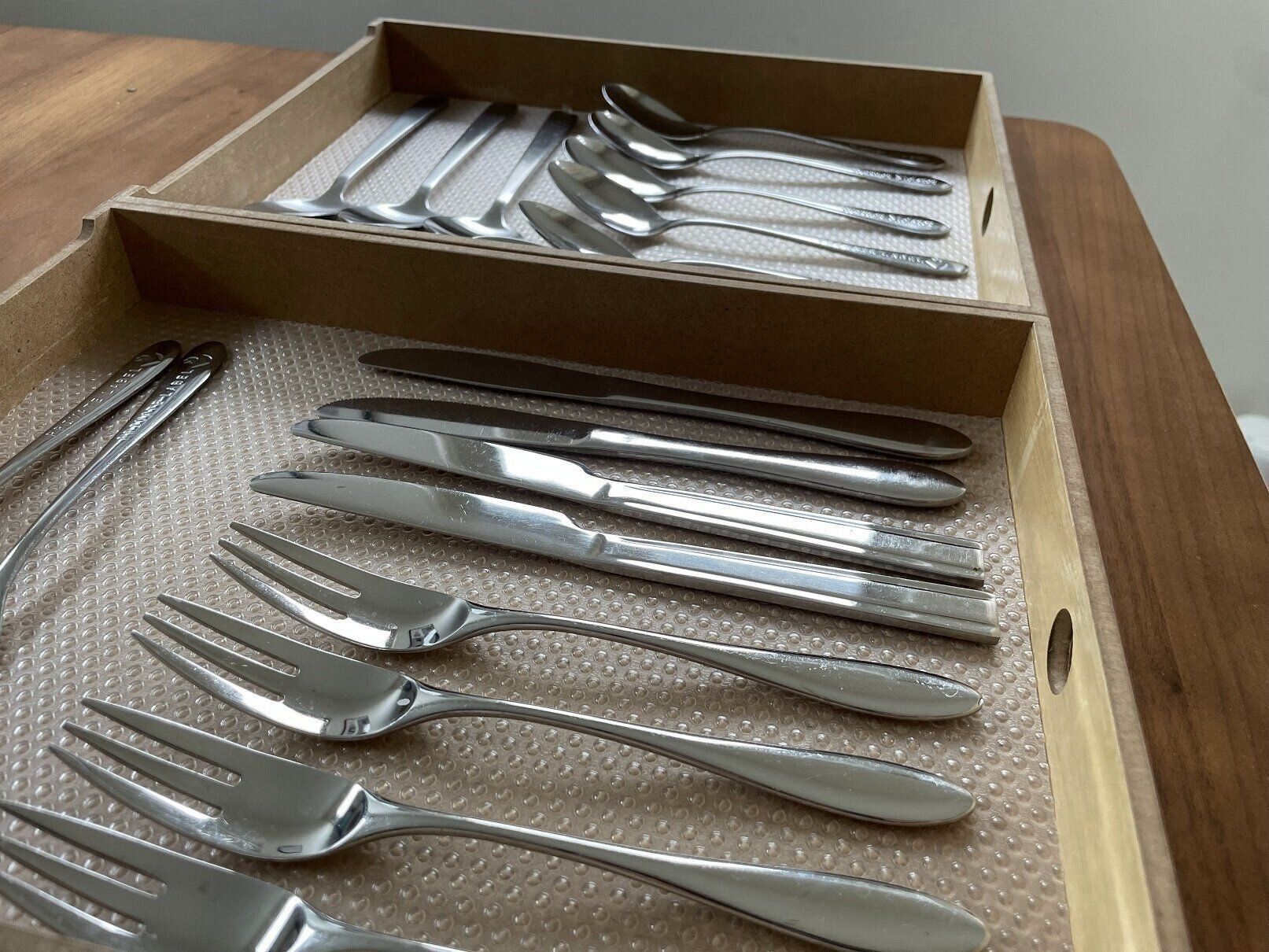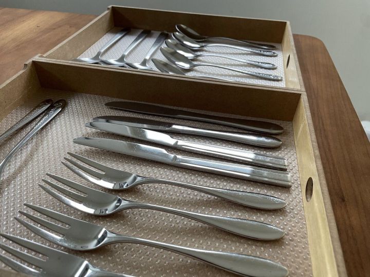 ニトリの3段ケースは引き出しが浅いので、カトラリー収納にもピッタリ。カトラリーを入れる際には、引き出しの底に食器棚シートなどをカットして敷きましょう。