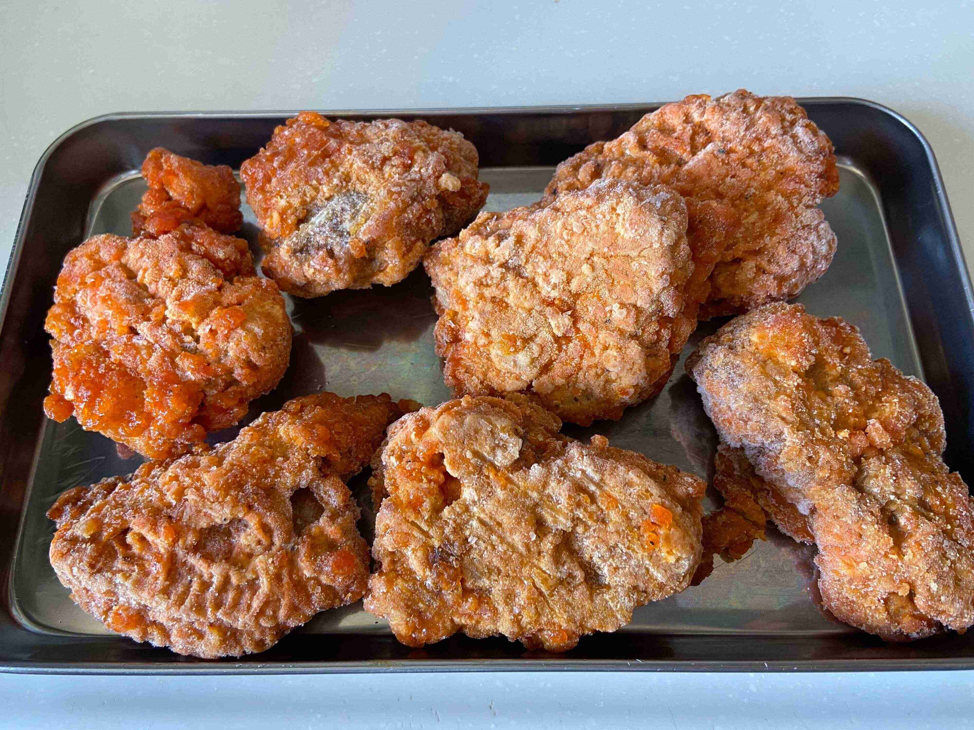 本場ではむね肉をたたいてのばし、大きな一枚にして揚げるお店が一般的ですが、業務スーパーの商品は食べやすいサイズでもも肉を使用しています。内容量は450g、全部で7個入っていました。