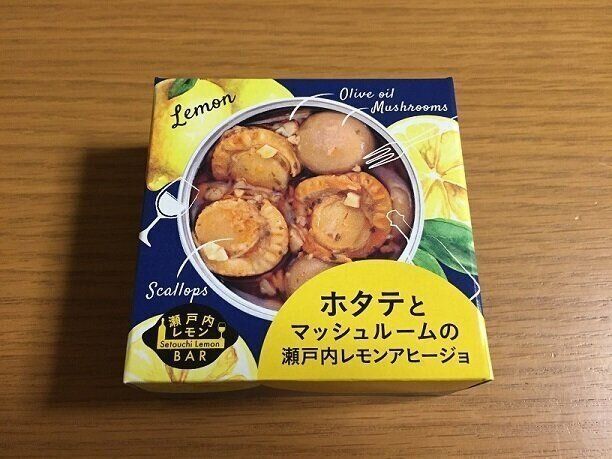 こちらは開けてすぐに食べられるおつまみ缶「ホタテとマッシュルームの瀬戸内レモンアヒージョ」(購入時:299円)です。