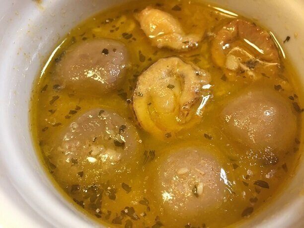 国産のホタテとマッシュルームにガーリックと瀬戸内レモンが効いたおしゃれなアヒージョ!