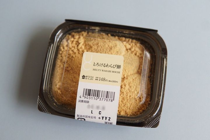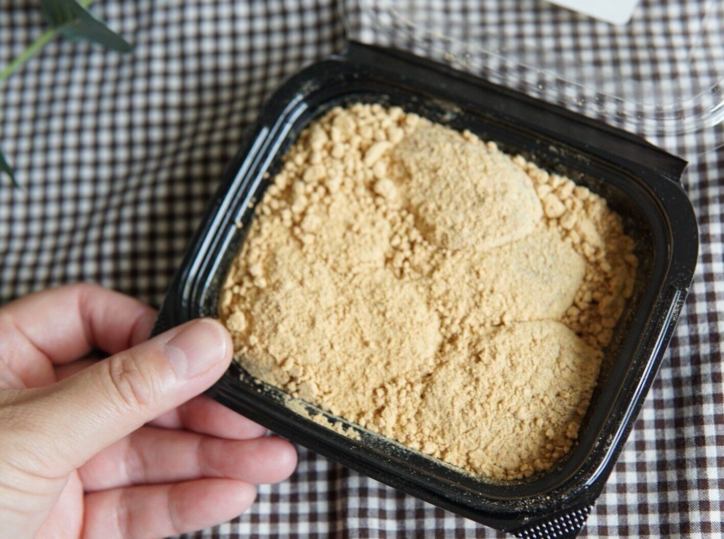 税込160円というお手頃価格なのに、3.5~4cmくらいの平たい形状のわらび餅が6個も入っていてボリューミーに感じます。まん丸ではなく平たい形状にすることによって、よりまんべんなくきな粉がまぶすことができるので、きな粉好きにはたまらないのではないかと思います。