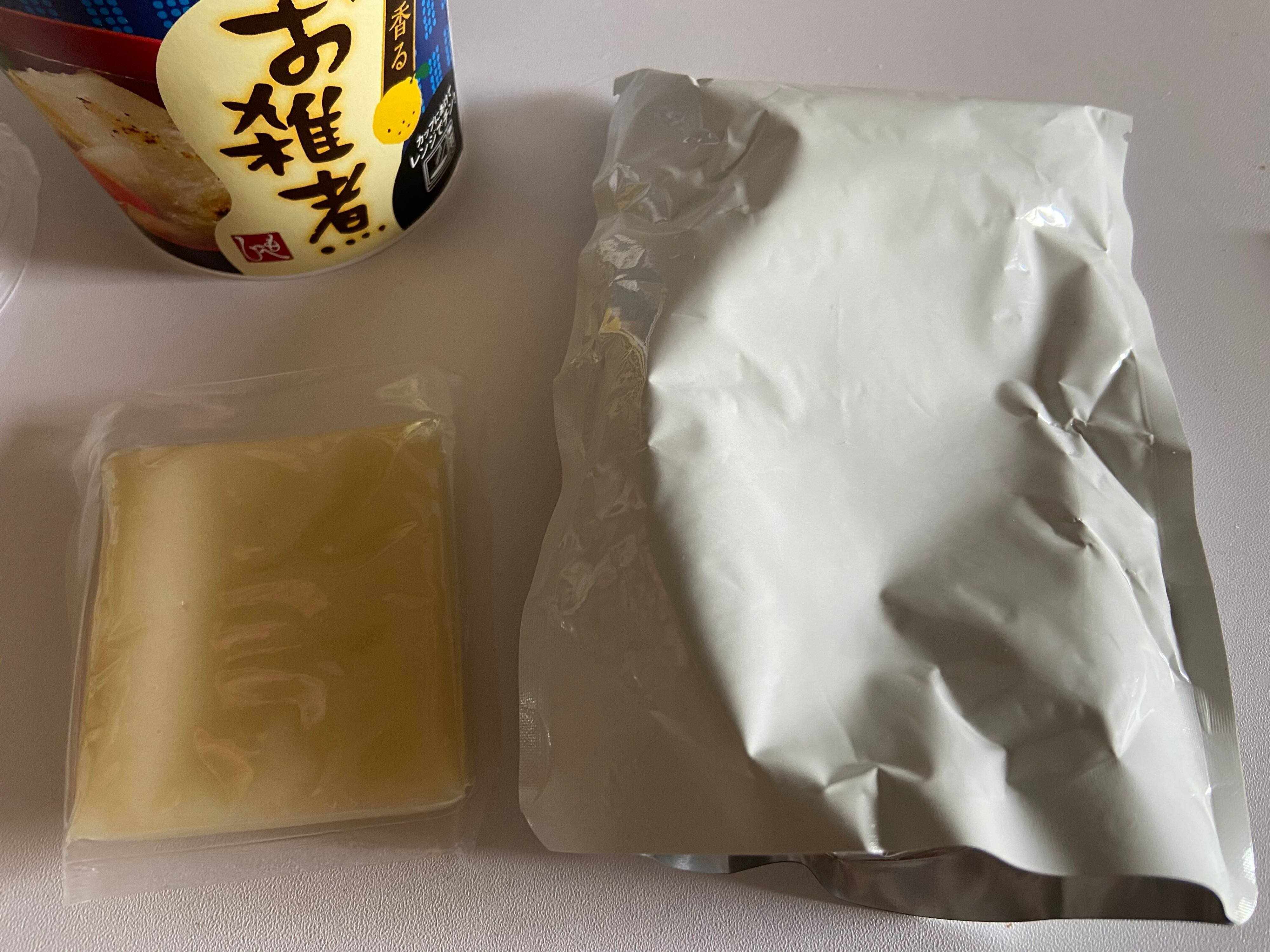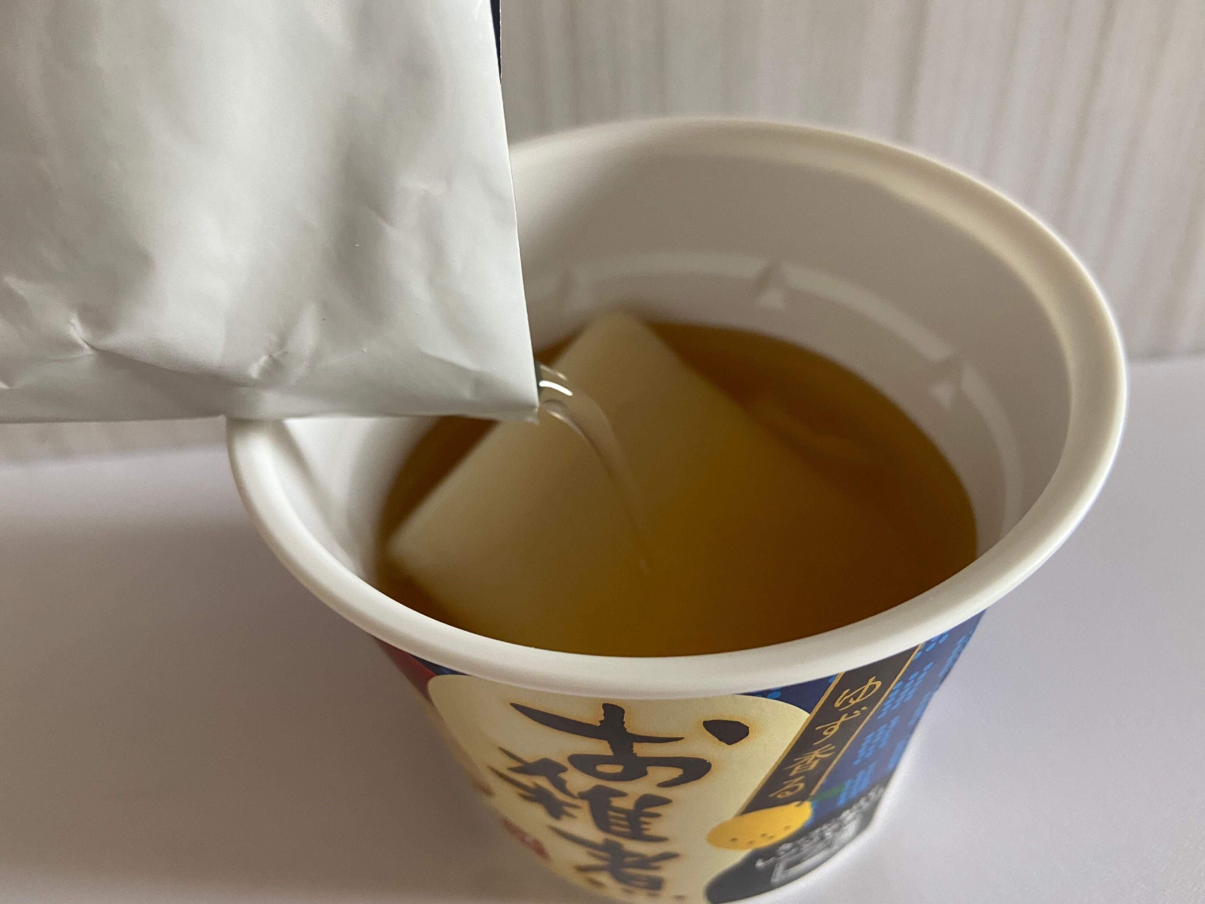 カップの中にはスープの入ったパウチと餅が1個入っています。