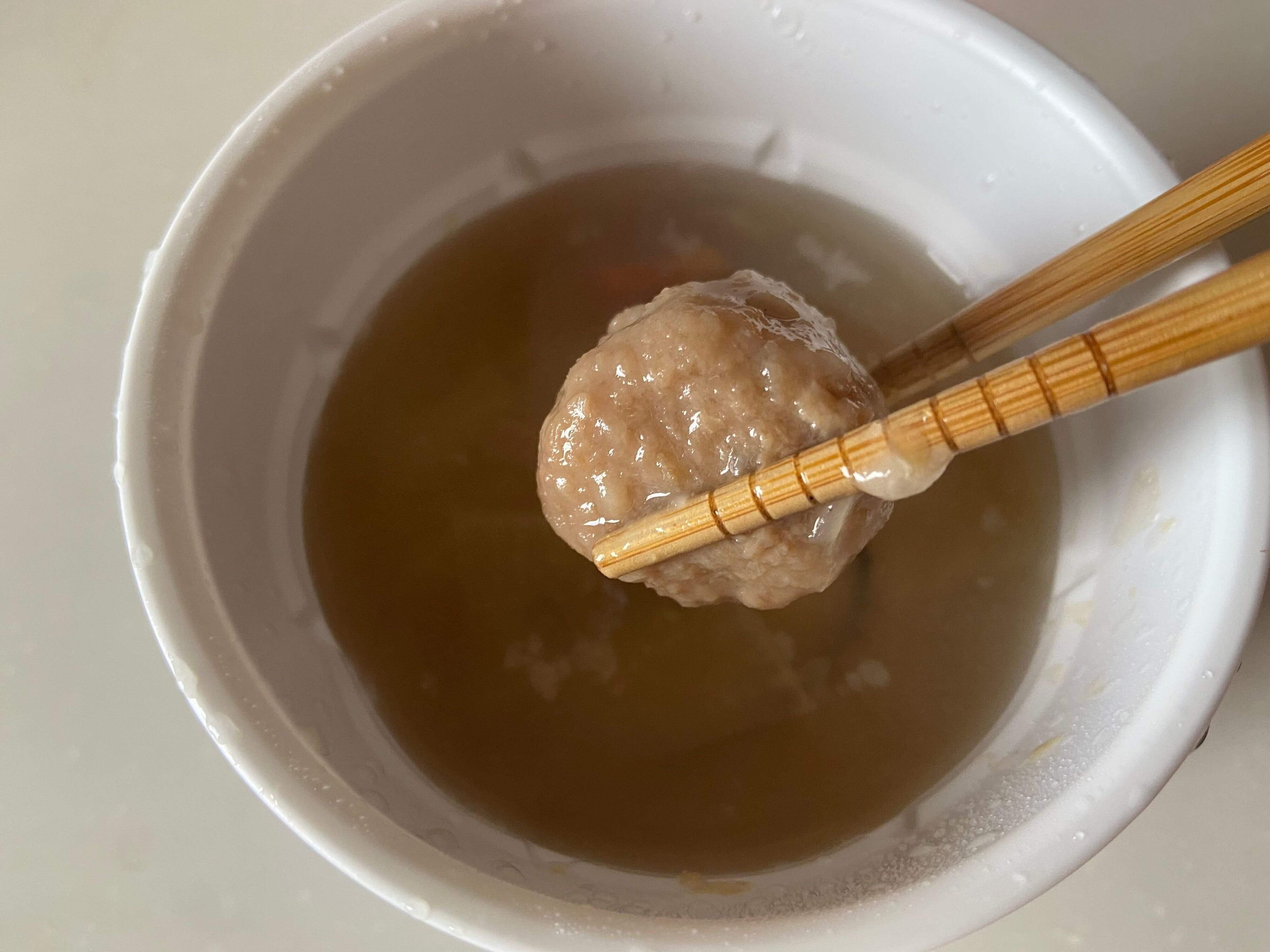 九州産ブランド鶏「華味鳥」を使用したつくねはプリッとした食感で旨みが強く食べ応えがあります。野菜は白菜、大根、人参、しいたけが入っていました。