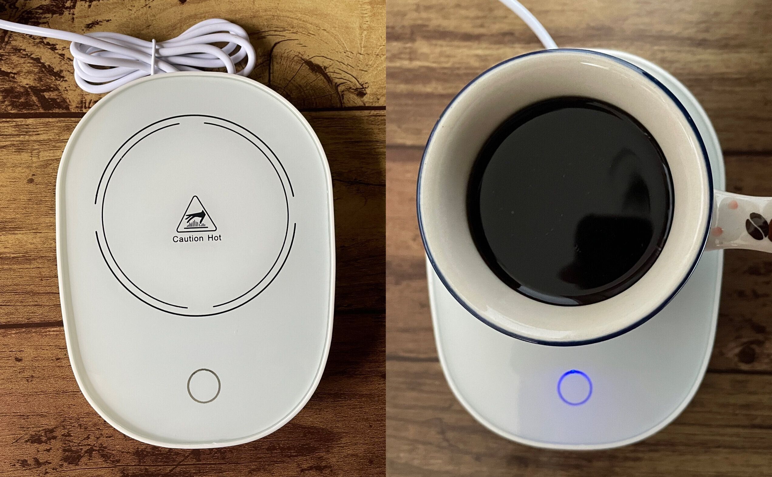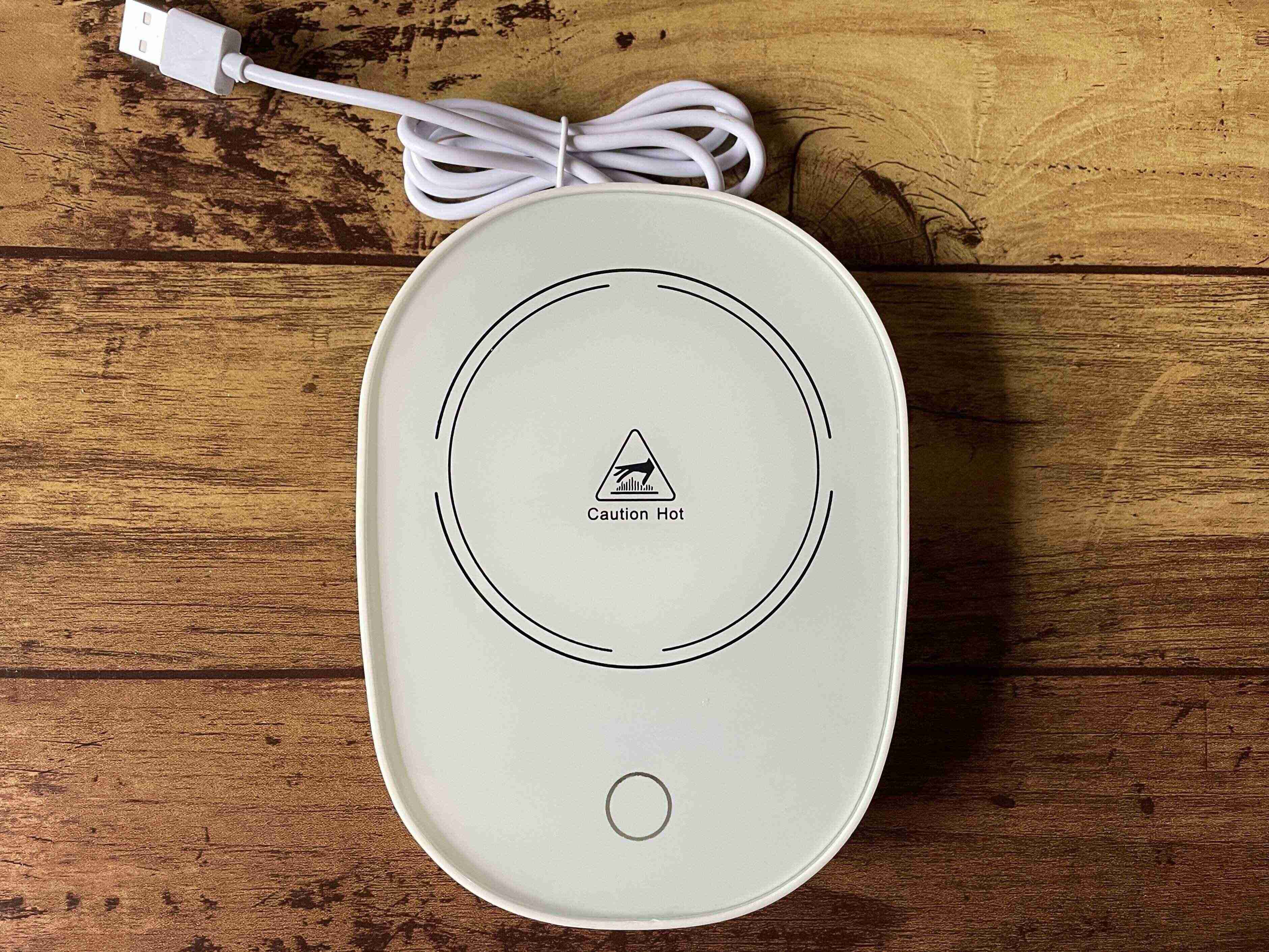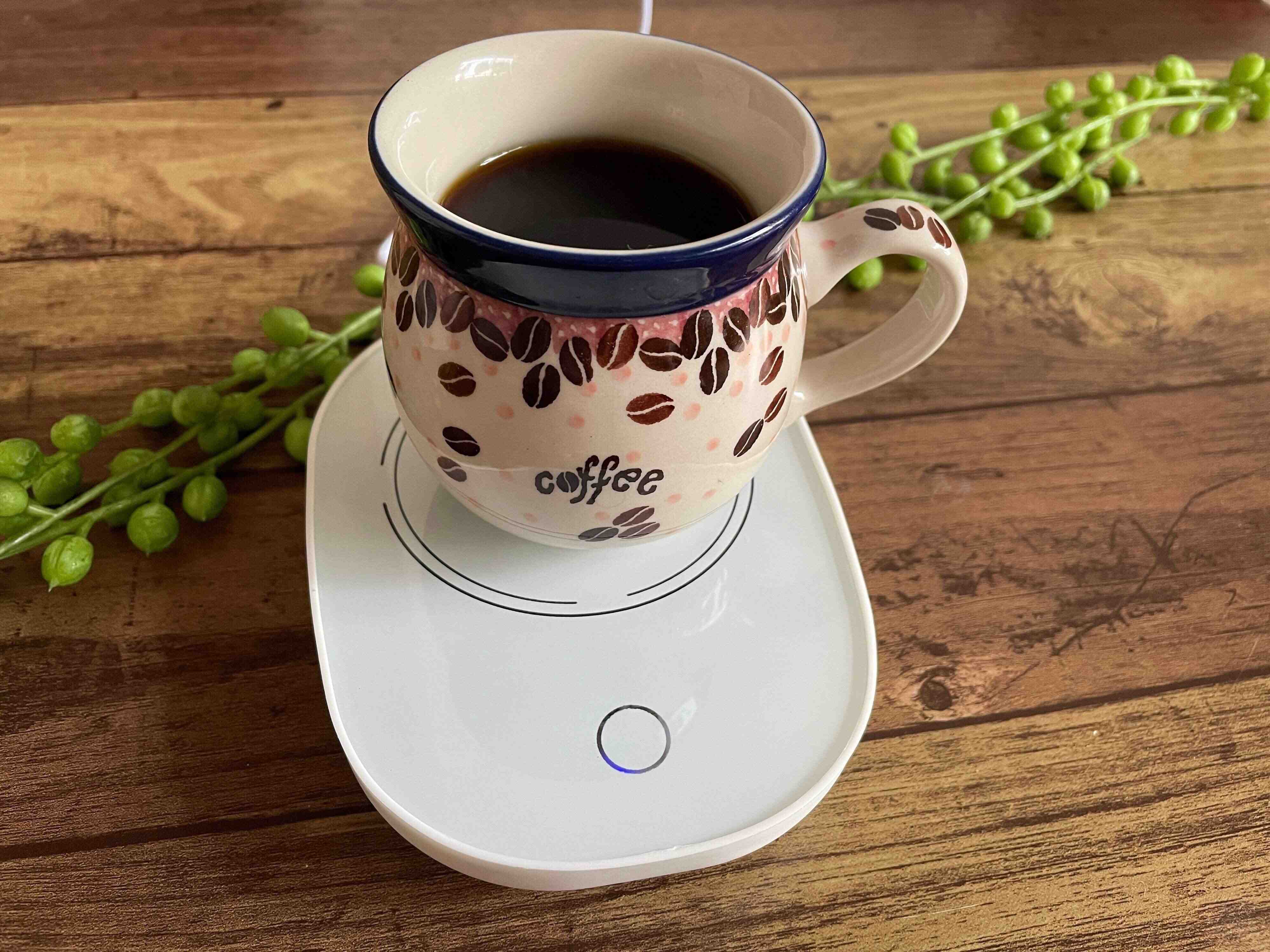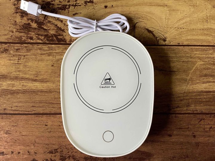 本体手前の丸い部分はスイッチではなく、電源オンを知らせてくれるランプ。上に飲み物を入れたカップをのせるとスイッチが入り、ランプが光るしくみです。電源の切り忘れがないのがいいですよね。