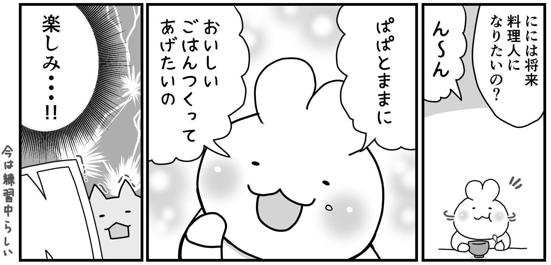 そんなににくんに「将来料理人になりたいの?」とたずねたところ、ににくんは首を横にふり、なんと「ぱぱとままにおいしいごはんつくってあげたいの」と答えたのでした!