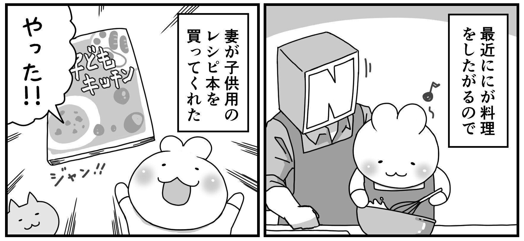楽しそうに料理をしているのは、パパ頭さんの息子さんのににくん。料理に興味を持つににくんに、ママが子ども用のレシピ本を買ってくれました。