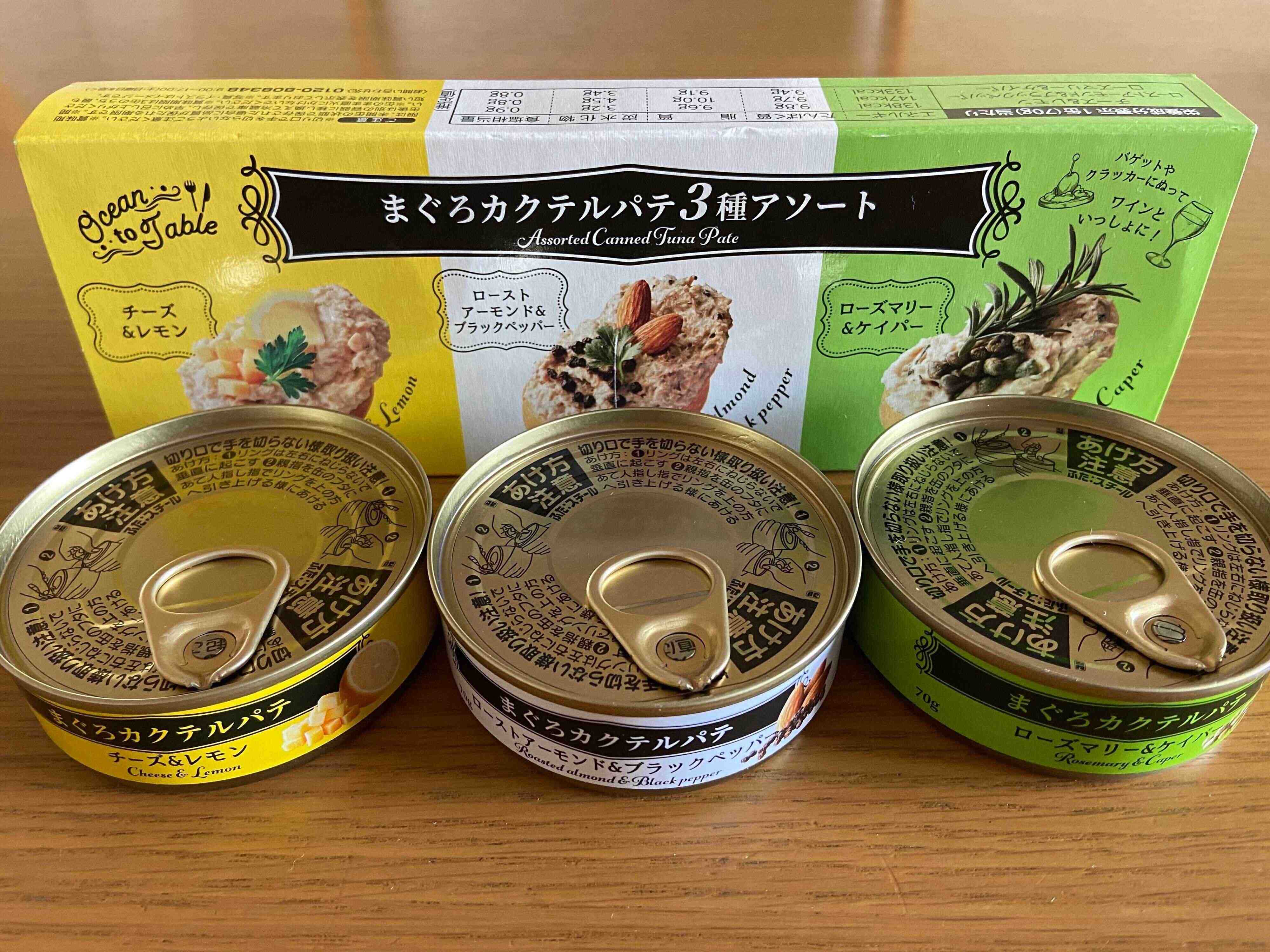 パッケージがとってもおしゃれな「まぐろカクテルパテ3種アソート」はチーズ&レモン、ローストアーモンド&ブラックペッパー、ローズマリー&ケイパーの3種のまぐろパテがセットになって価格は税込354円。