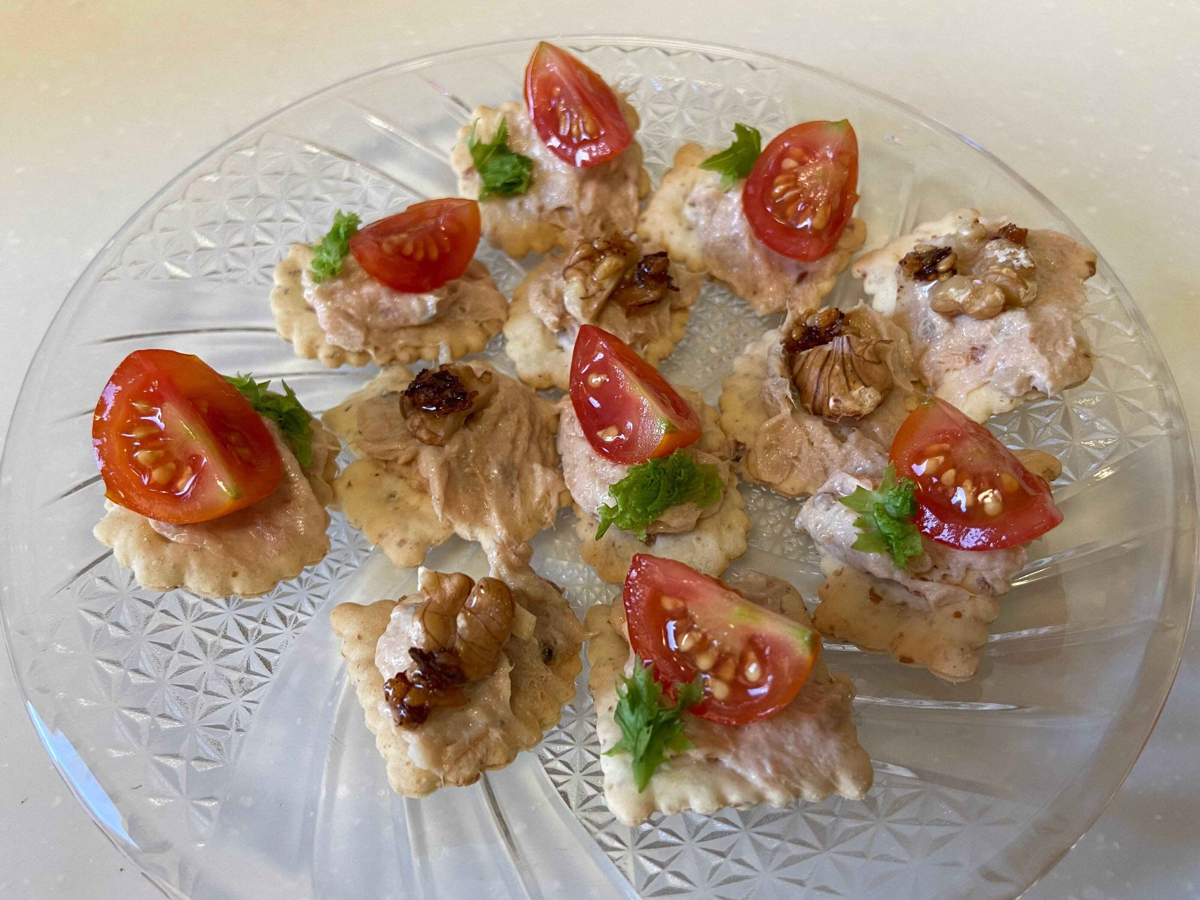 ミニカナッペ風にまぐろパテをクラッカーに塗って、具材をそれぞれトッピングしてみました。チーズ&レモンは爽やかなレモンの風味でさっぱり!ローストアーモンド&ブラックペッパーはナッツの風味とピリッと辛みがやってきて大人向けテイスト!ローズマリー&ケイパーはハーブの香りが豊かでおいしい!