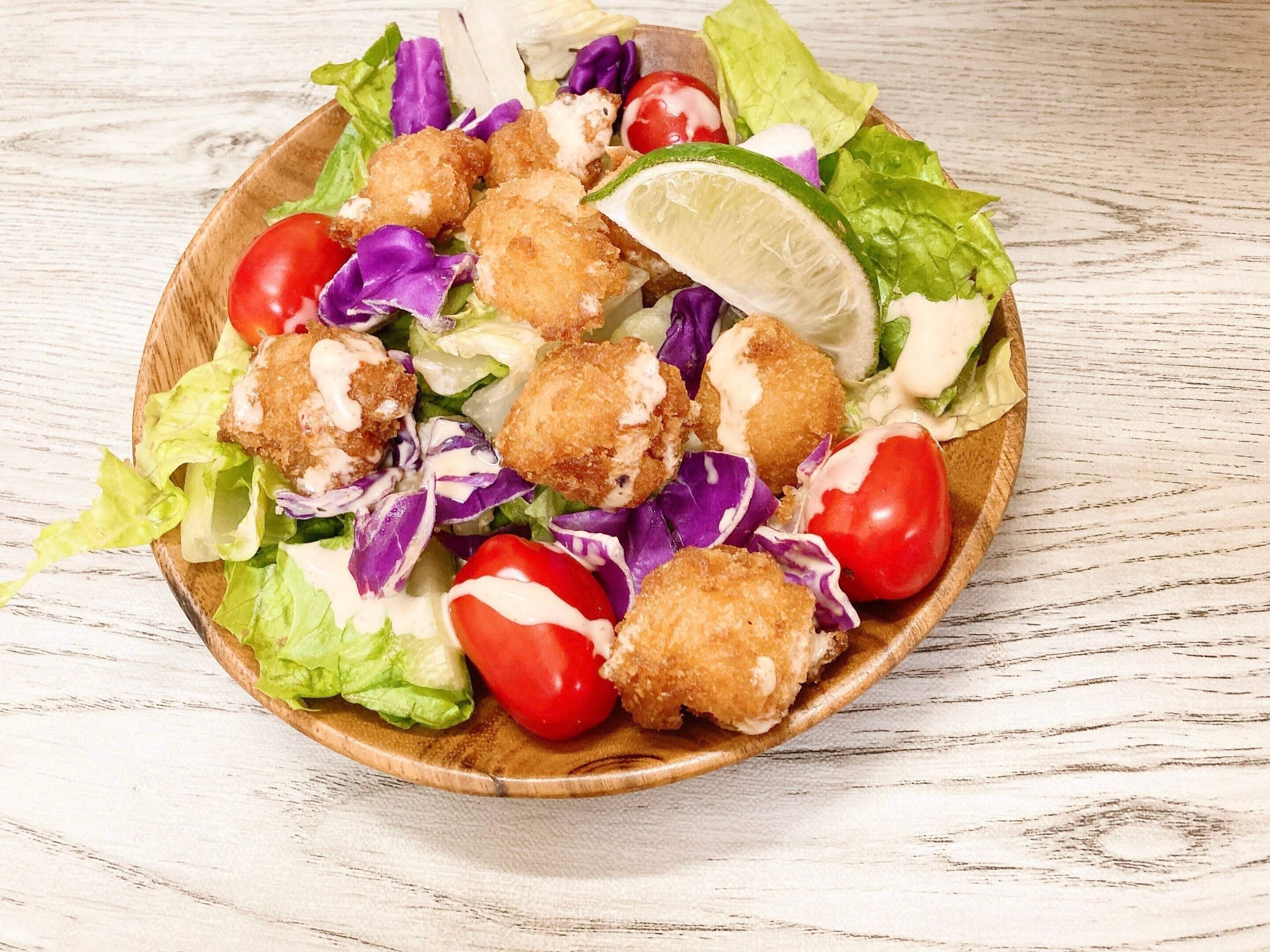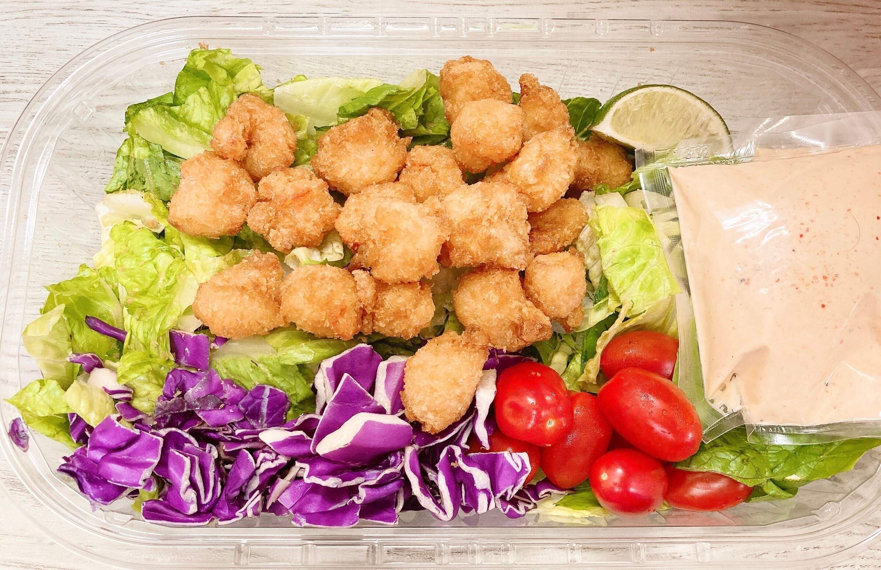 聞き慣れない名前と揚げ物がのったインパクトのあるサラダがコストコに新登場!ロメインレタス、紫キャベツ、ミニトマト、小えびフライ、小袋のドレッシング、ライムが入っています。