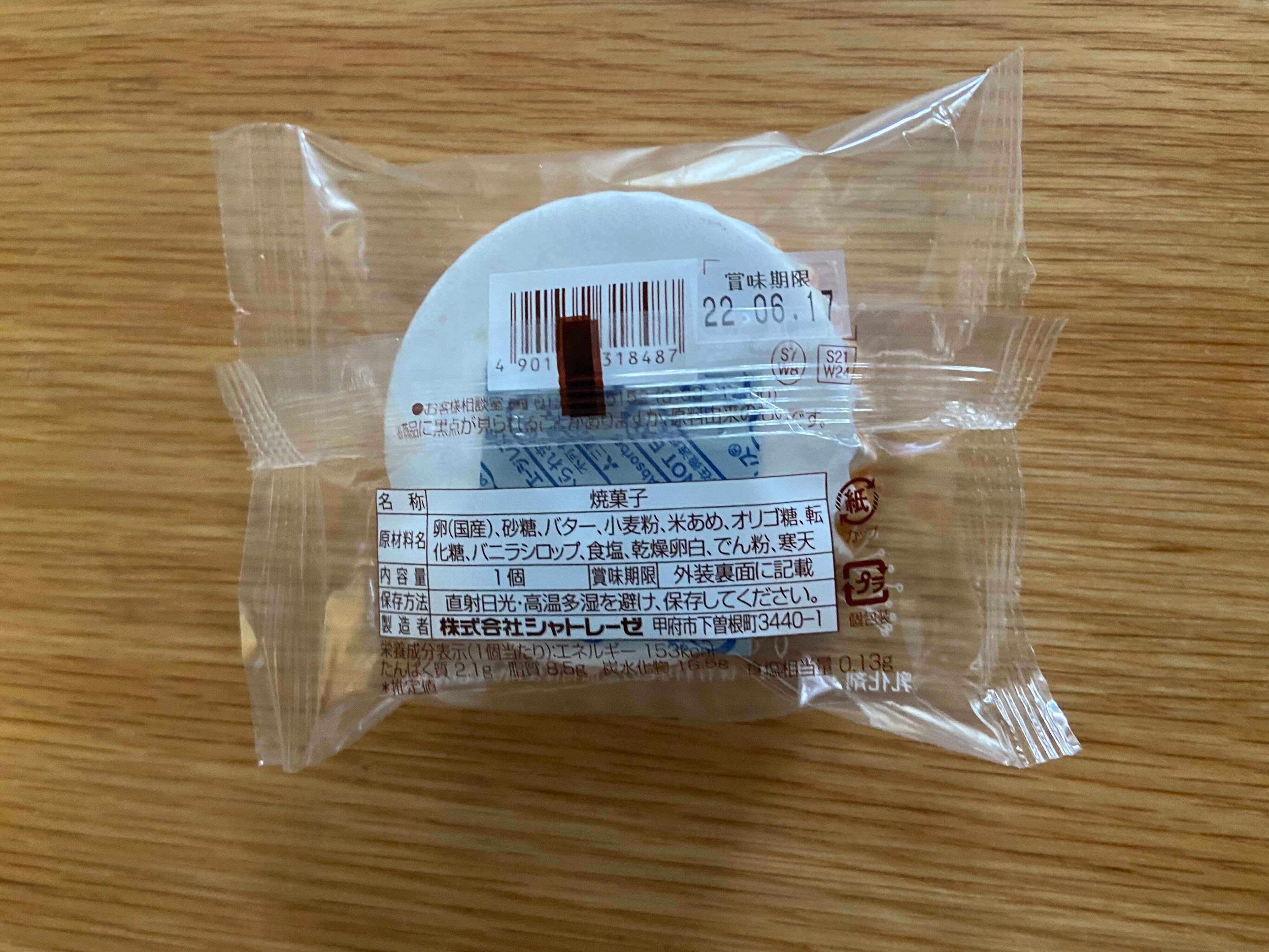 原材料は、卵(国産)、砂糖、バター、小麦粉、米あめ、オリゴ糖、転化糖、バニラシロップ、食塩、乾燥卵白、でん粉、寒天。