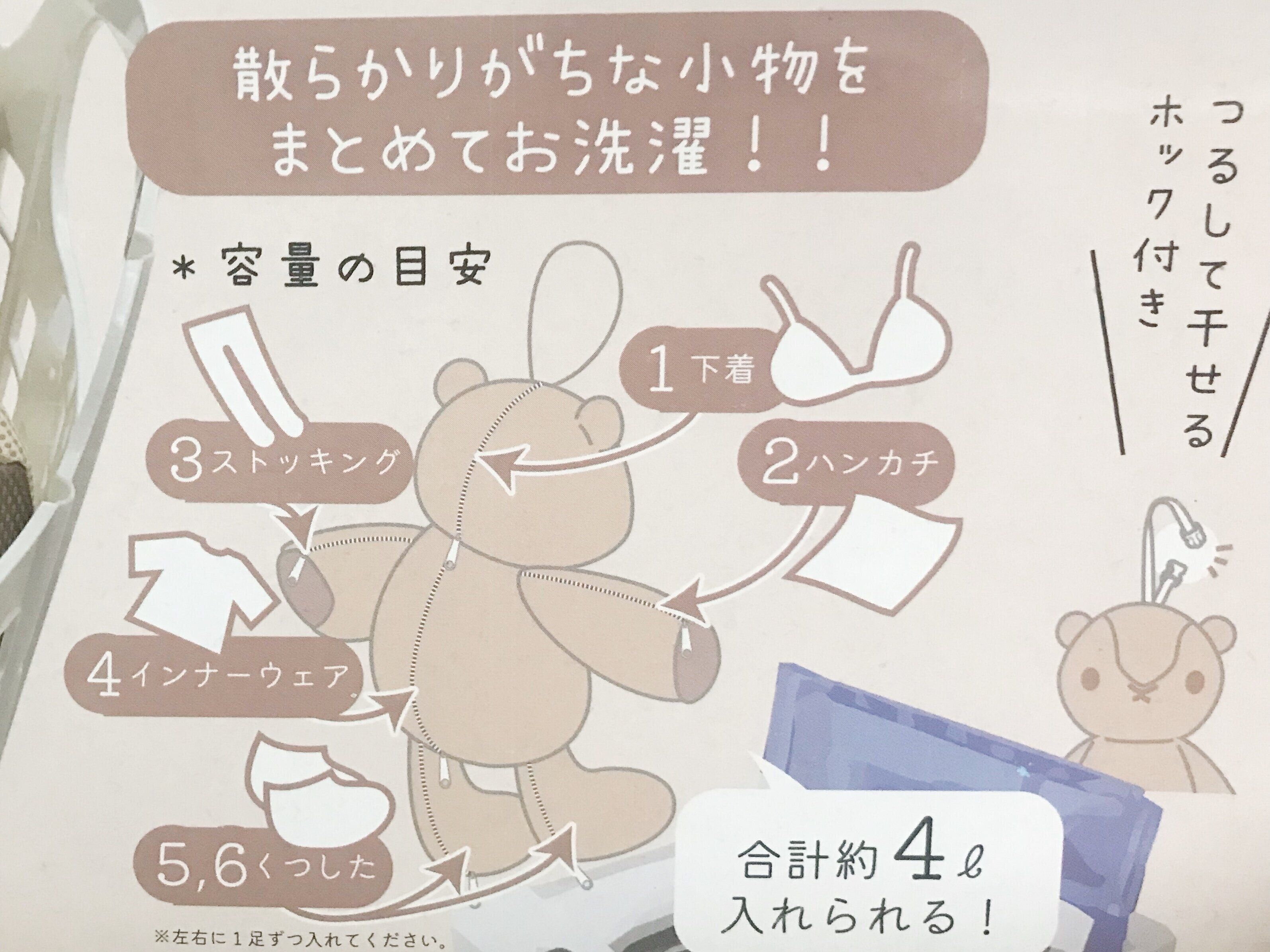 くまさんには、6か所に洗濯ものを入れることができます。靴下やマスクなど細かいものが洗濯機の中でバラつかないのでかわいいだけでなく機能的にも大満足。