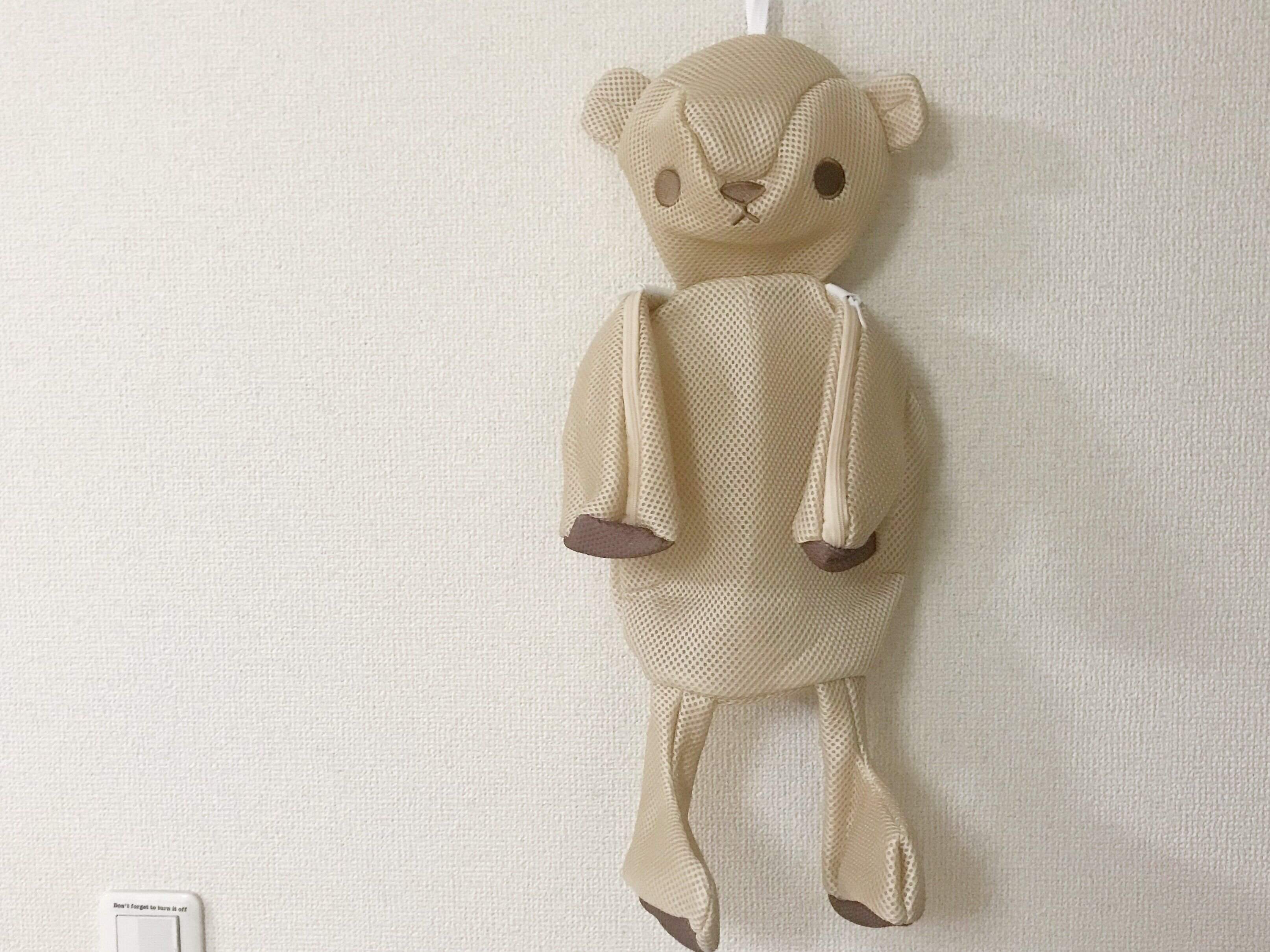 実際に洗濯ものを入れてみたのですが、意外とスリム!ちょっとイメージとは違ったけれど、くまさん1体に6ポケット分細々した洗濯ものを入れる事ができる使い勝手は◎。何より見た目がかわいいのでテンションが上がります。(細いけど。)