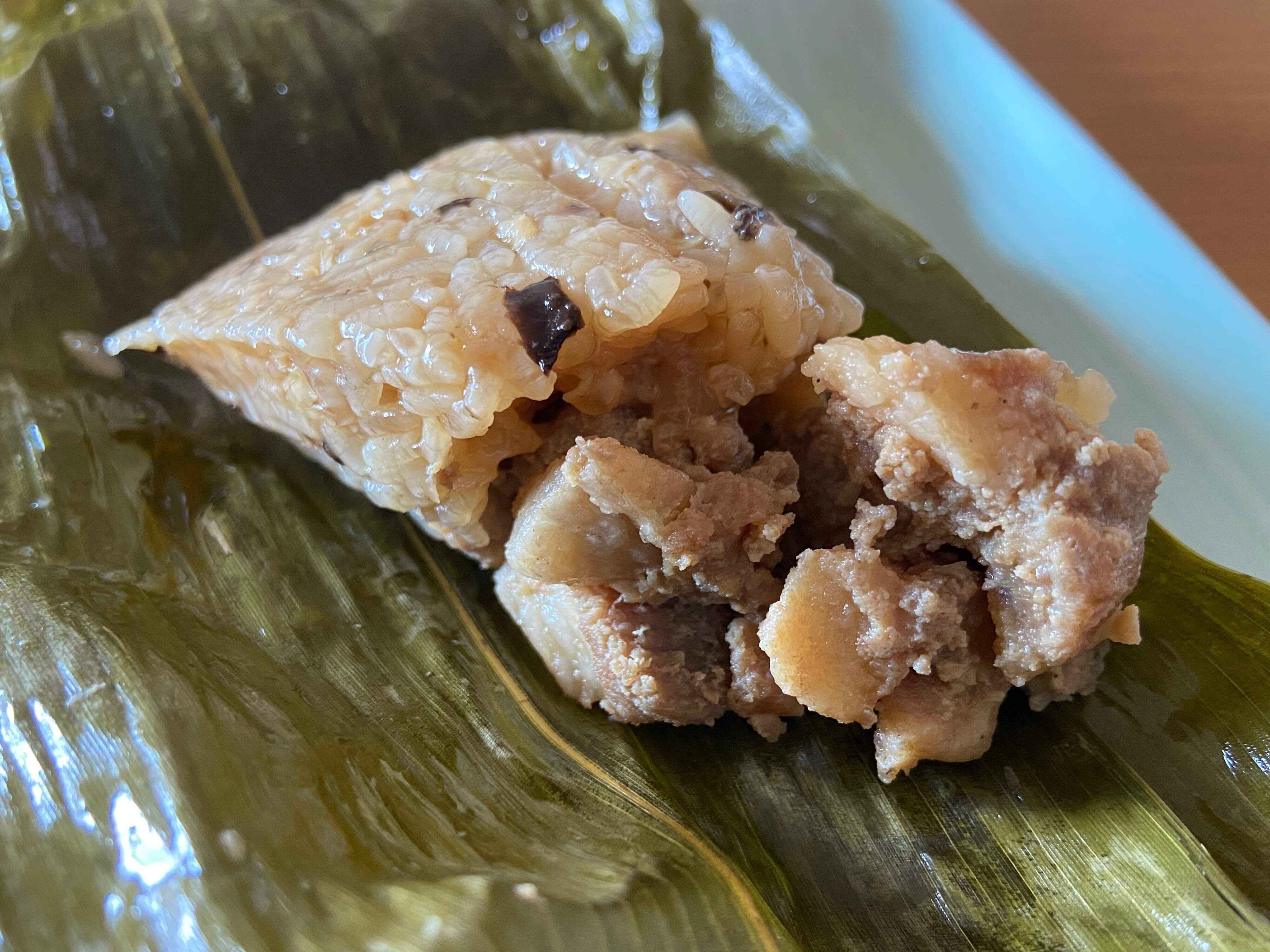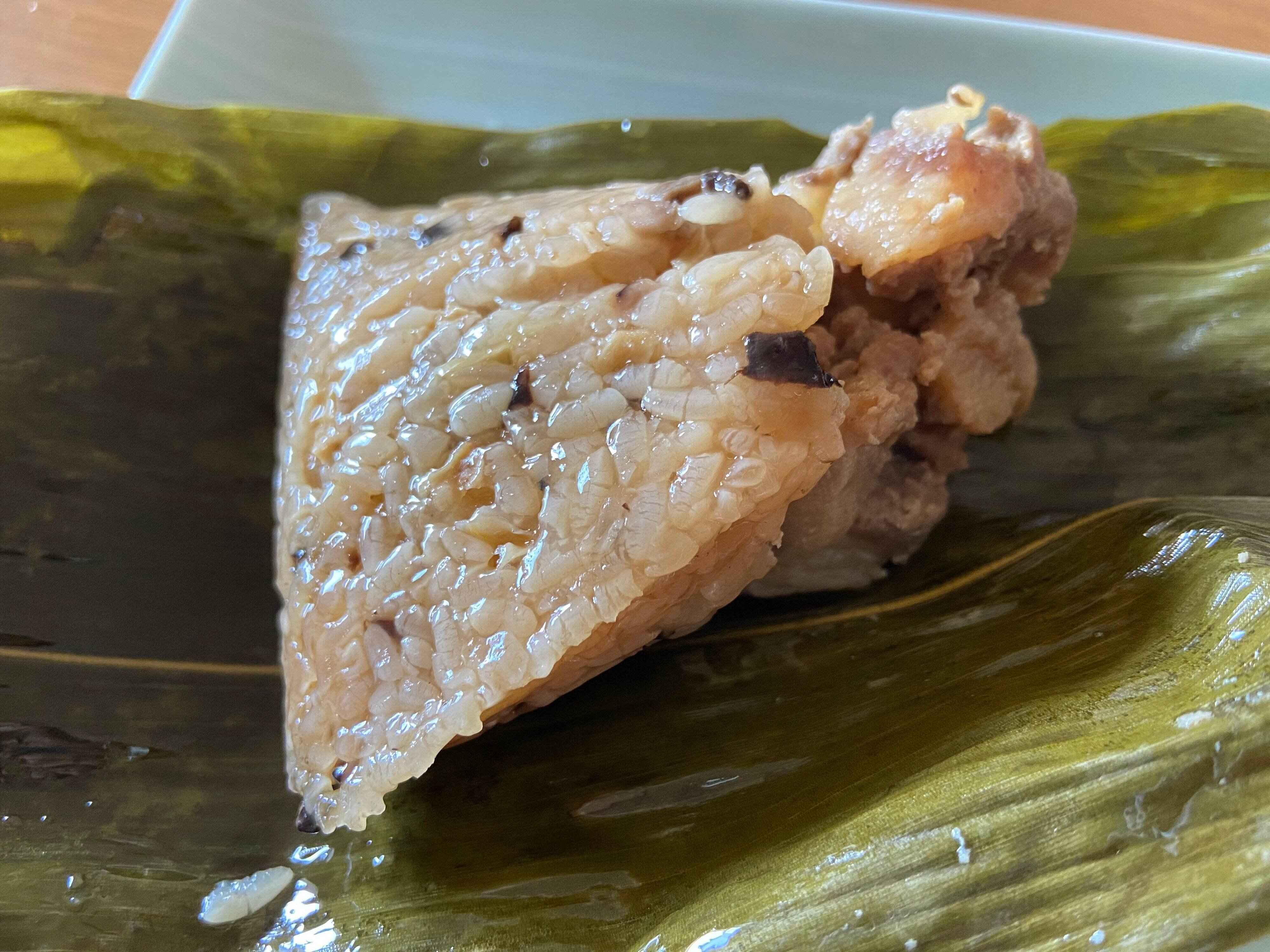 驚いたのがこの豚肉。味が染みてほろっと柔らかく脂も甘みがあっておいしい角煮がごろごろとたくさん入ってるんです。細かくカットされたしいたけやたけのこも入って食感もよく、味わい深いちまきです。