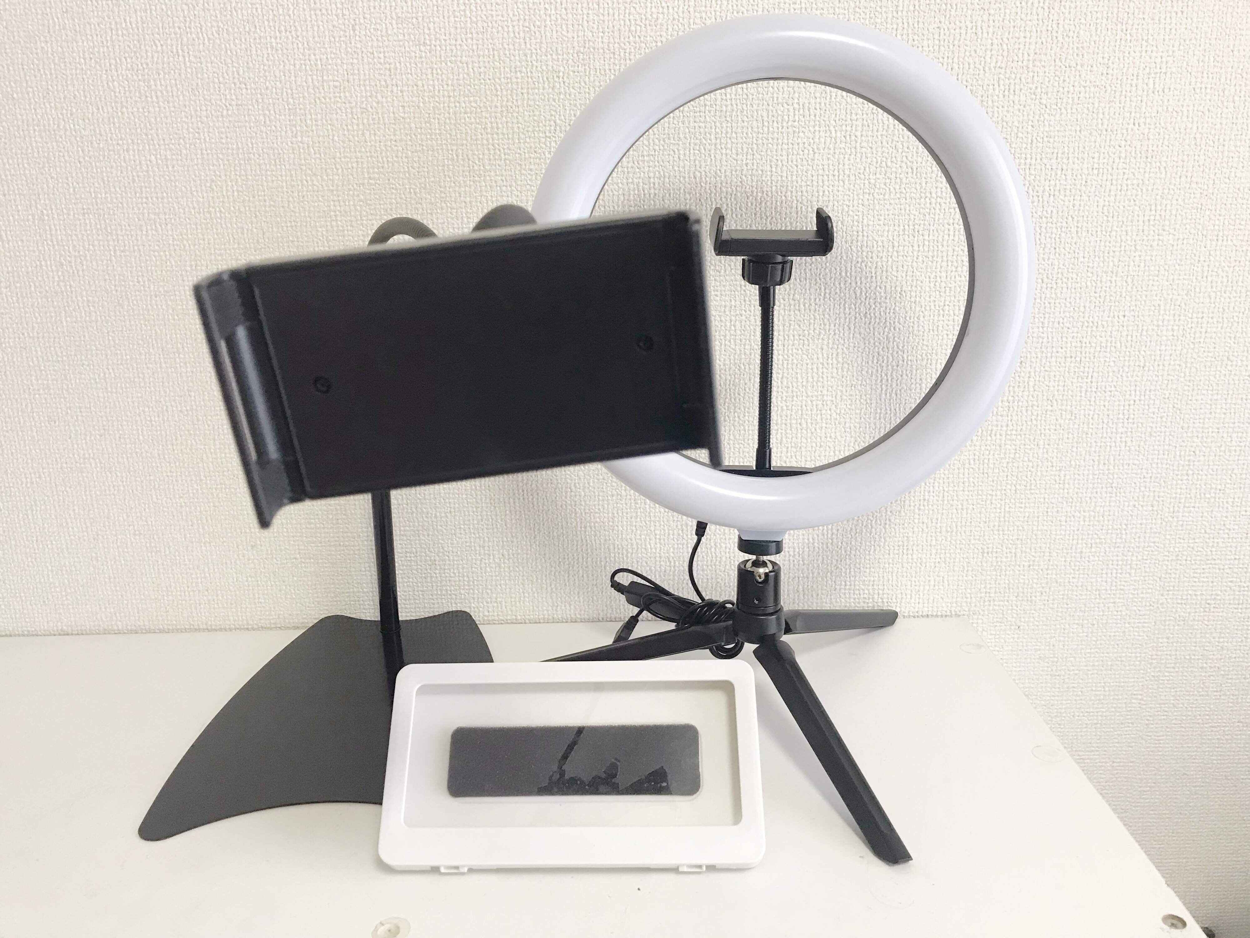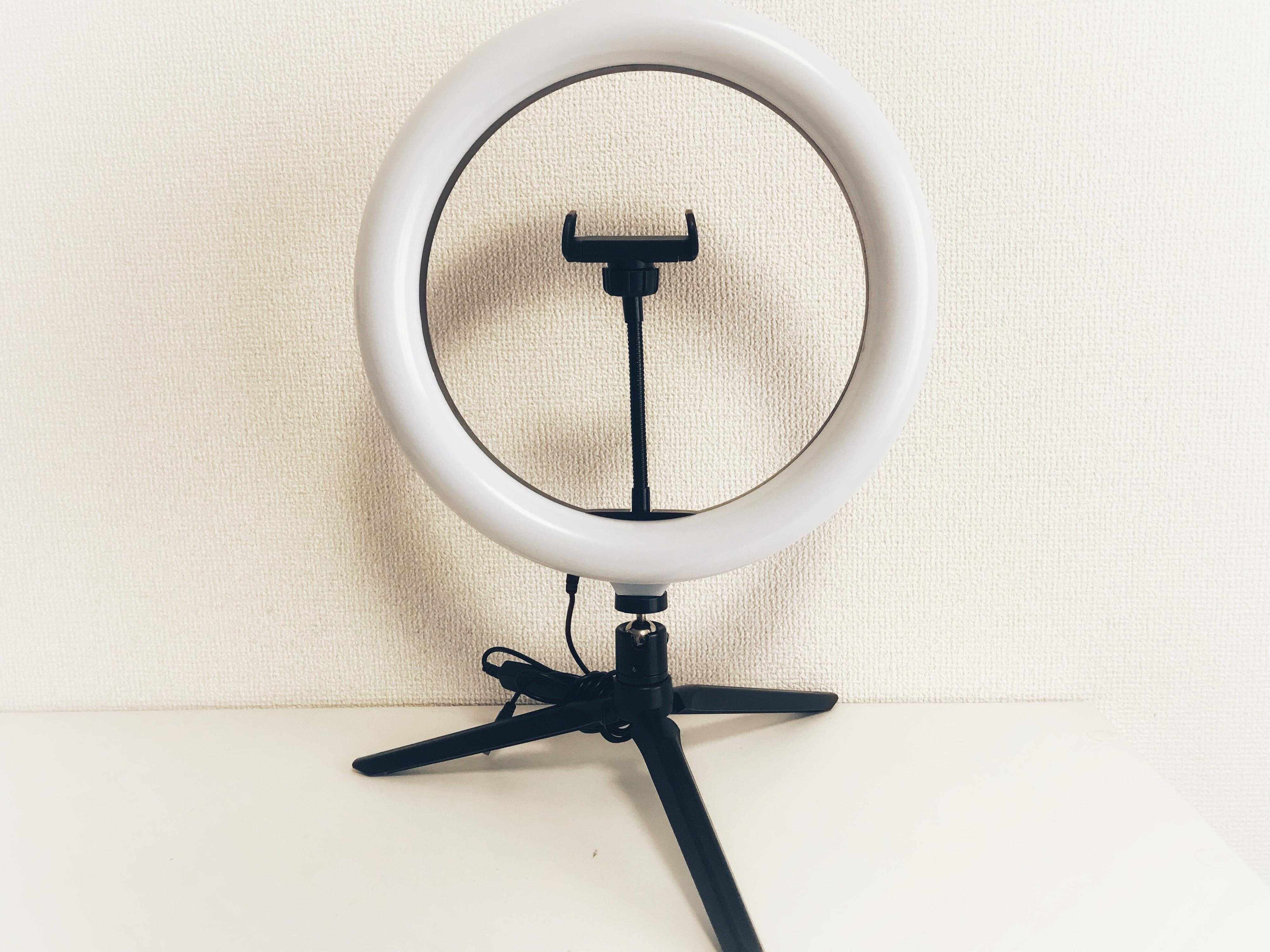 LEDリングライトスマホスタンド(1,650円)はオンライン会議や撮影の時に使用すれば女優ミラーのように肌を実際よりも2割増にしてくれるおすすめアイテム。リングの中央にスマートフォンをセットできる仕様になっています。