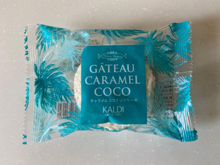 常夏を思わせるおしゃれなパッケージの「ガトーキャラメルココ」(購入時:194円)は、ココナッツがたっぷりとのったキャラメルケーキです。