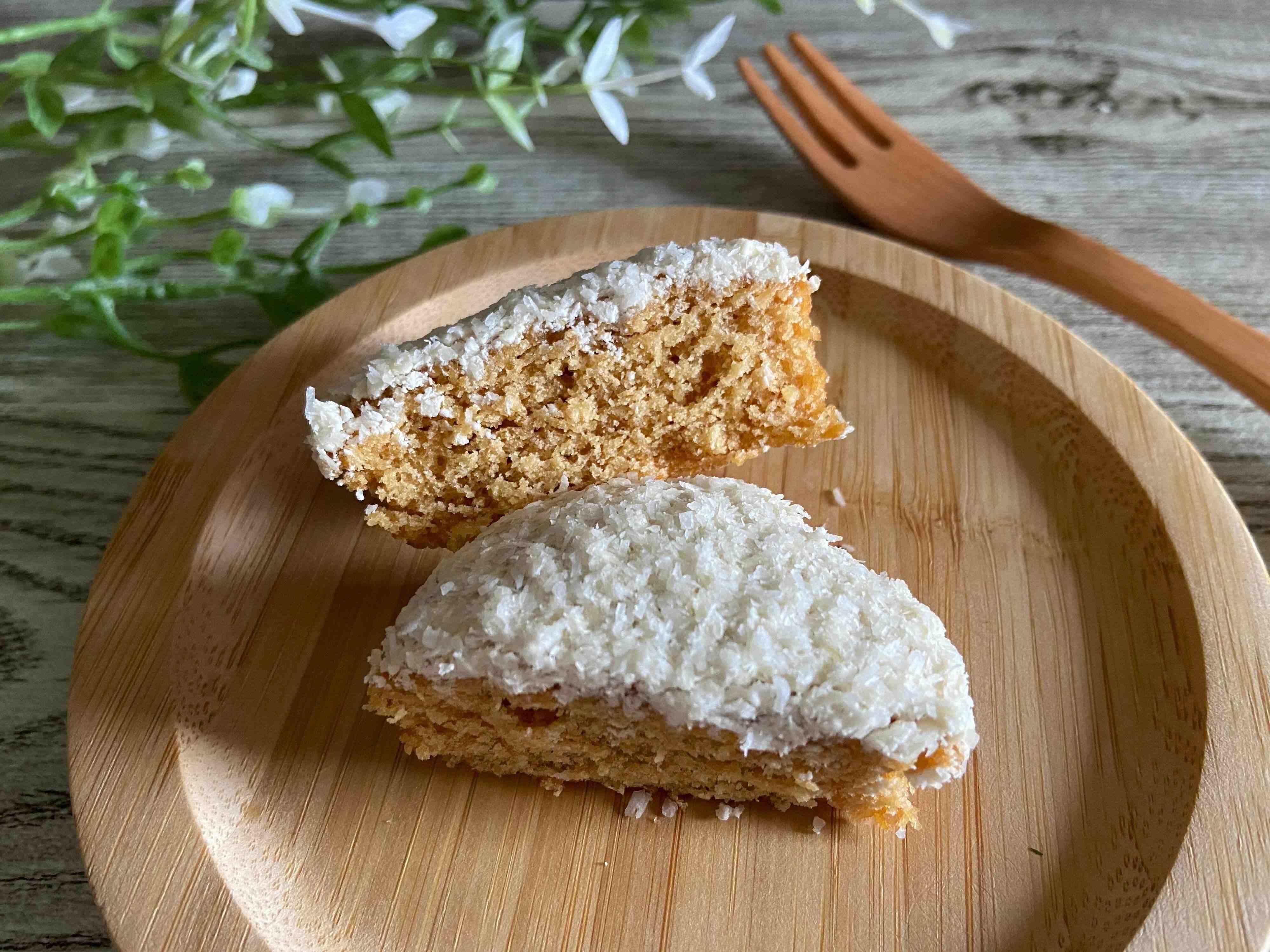 食べてみるとココナッツの存在感がすごい!ココナッツロングのシャキシャキッとした食感と甘く濃厚な風味が口いっぱいに広がります。その下のココナッツ風味のアイシングがしっかり甘く、最後にケーキ部分のキャラメル味がほんのりやってきました。キャラメルはほろ苦さがなく甘いタイプのキャラメル味です。