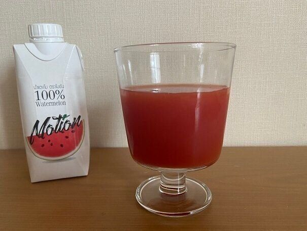 こちらはカルディで購入しました。タイ産のスイカ100%ストレートジュースで、原材料はスイカのみ。330mlの飲み切りサイズです。