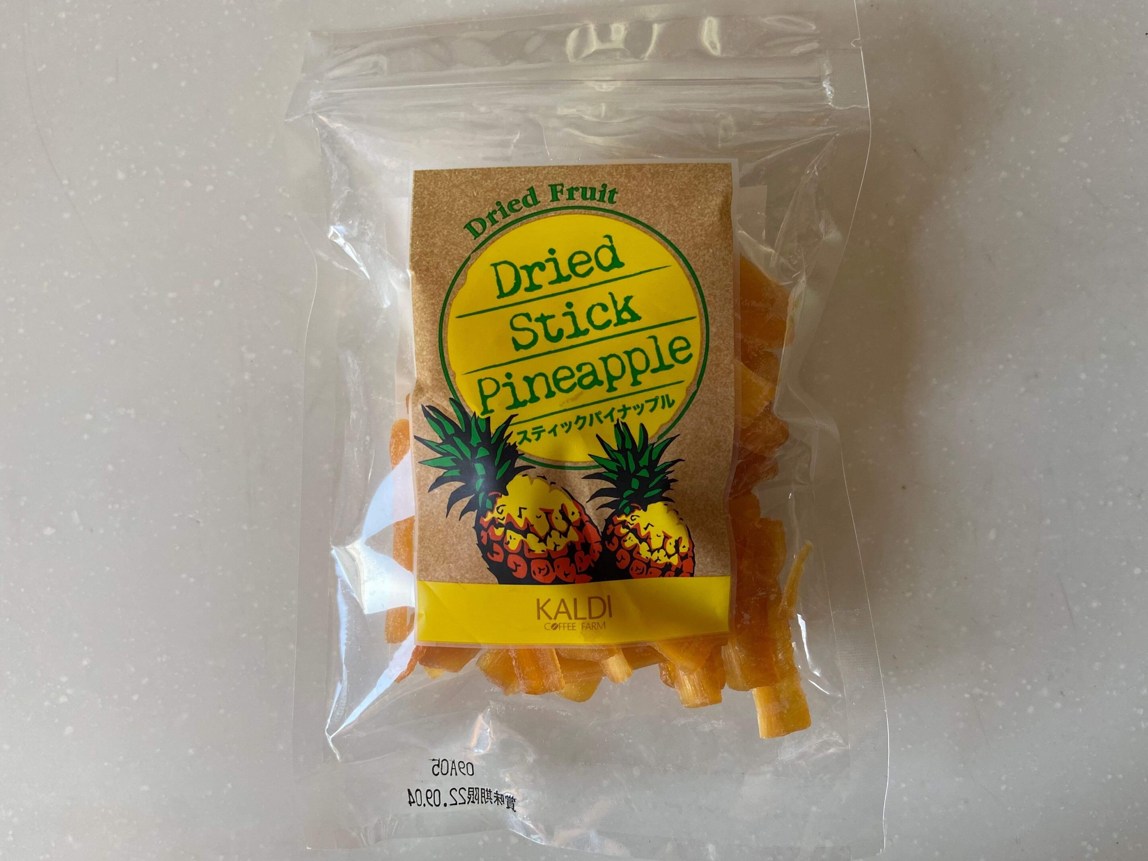 カルディのドライフルーツ売り場で珍しい商品を発見しました。スティックパイナップル(購入時:270円)です。
