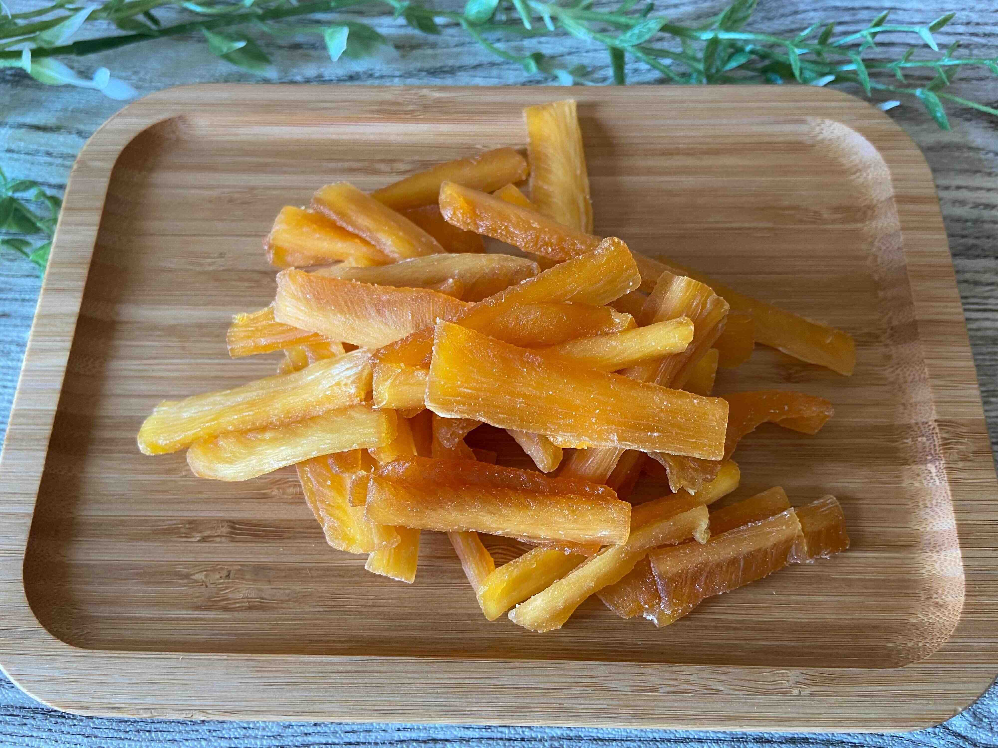 中身を全部出してみました。一見、干し芋のようにも見えますが、よく見ると繊維があってパイナップルの芯だというのがわかりますね。
