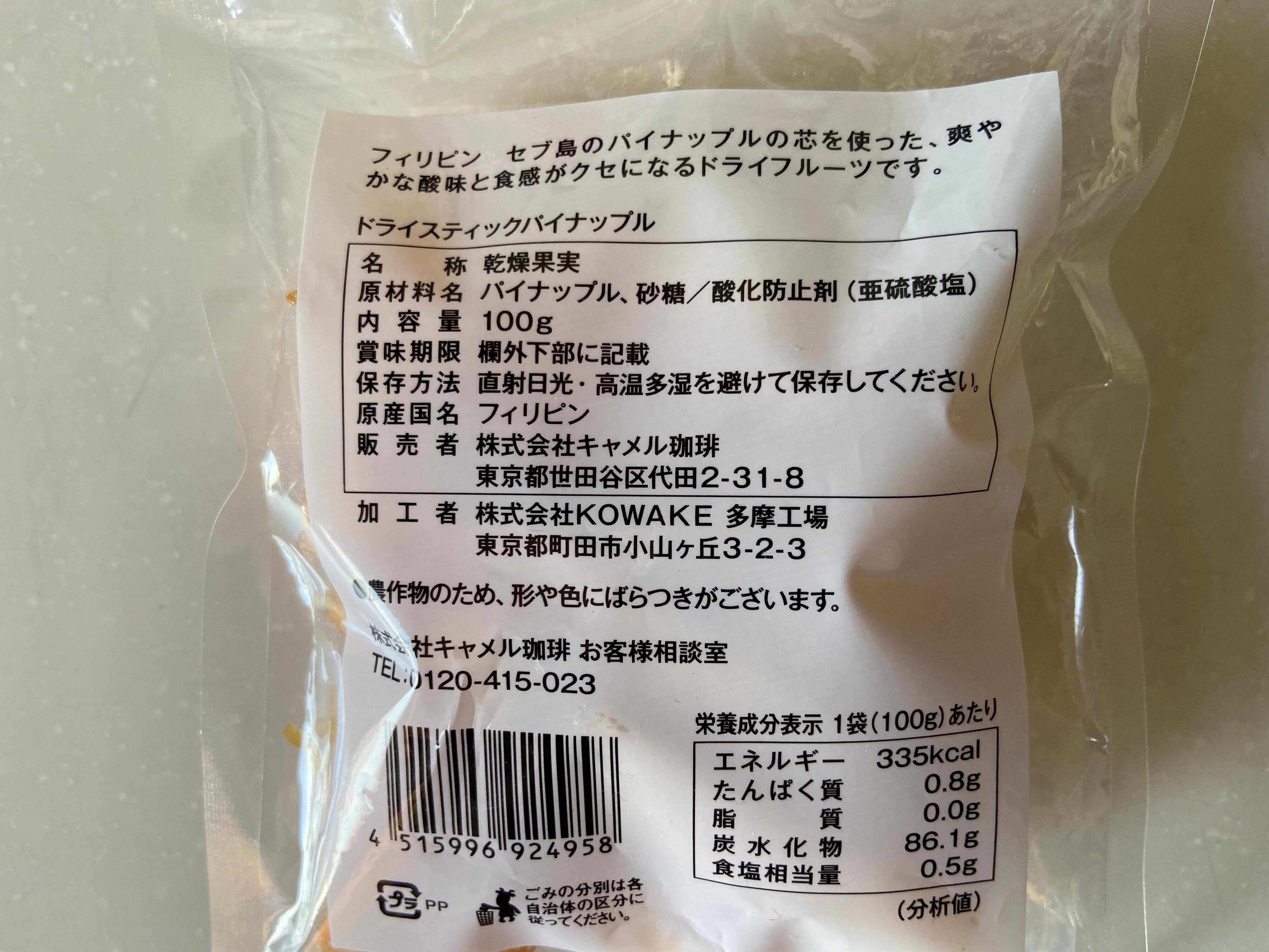 フィリピンのセブ島のパイナップルを使用、1袋当たり335kcalで食物繊維たっぷりのドライフルーツとのこと。