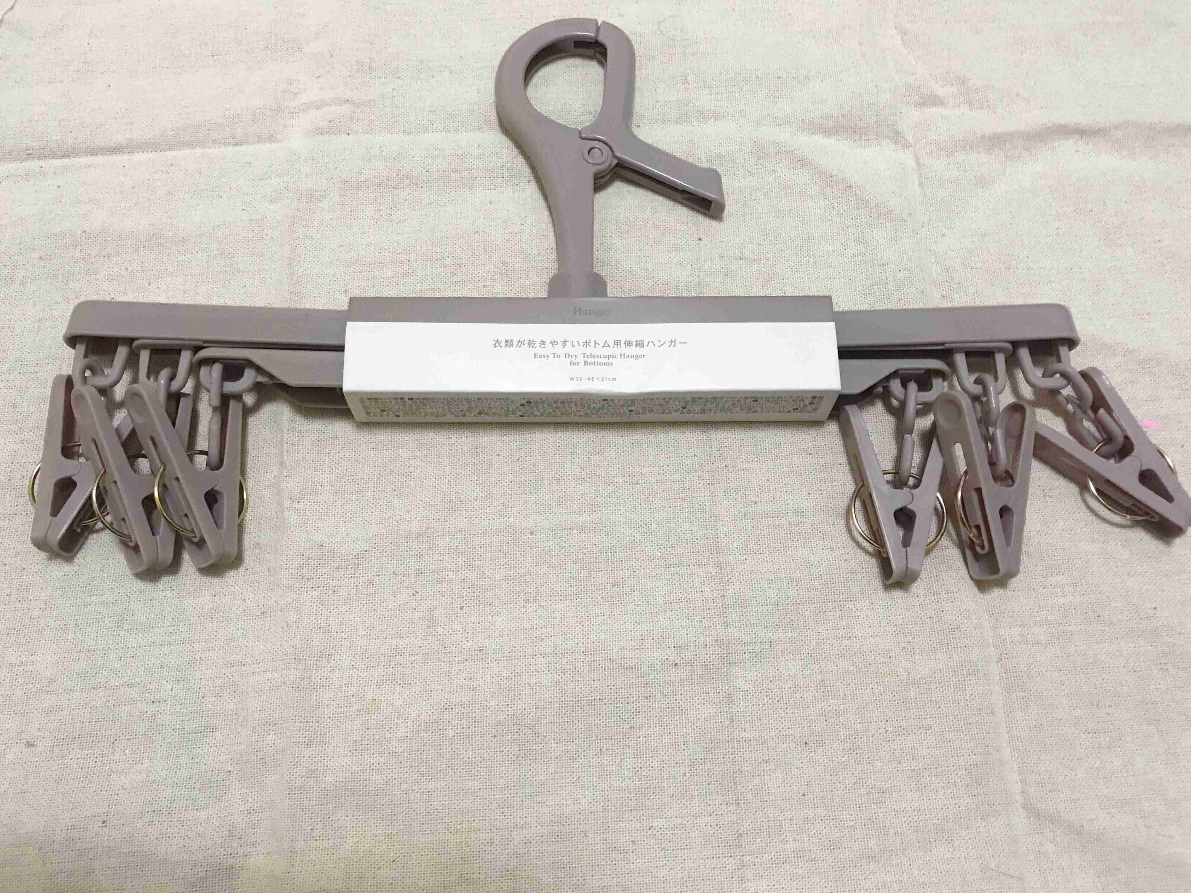 デニムなどの長ズボン類は梅雨のお洗濯のラスボスといっても過言ではありません。普通に干すと部屋干しではなかなか乾かないボトムスにおすすめなのが「衣類が乾きやすいボトム用伸縮ハンガー(330円)。